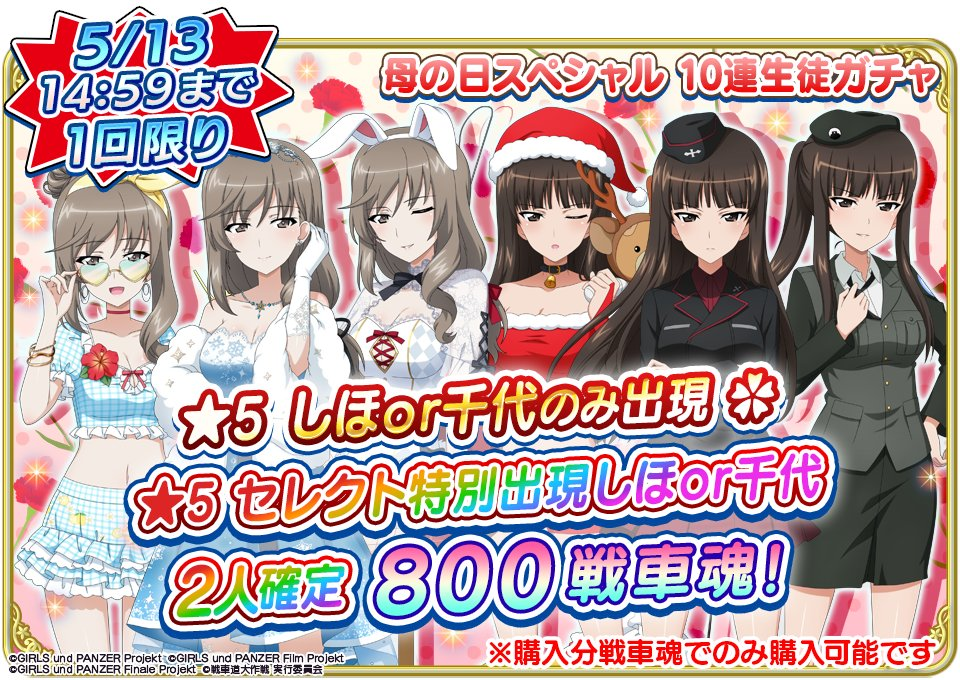 在上週末期間,官方推出了母親節活動,大推所有島田千代 & 西住志穗兩位在原作中高人氣的母親角色全造型池,也引爆玩家大抽特抽,讓粉絲戲稱 : 「原來是少婦與戰車阿 www。」