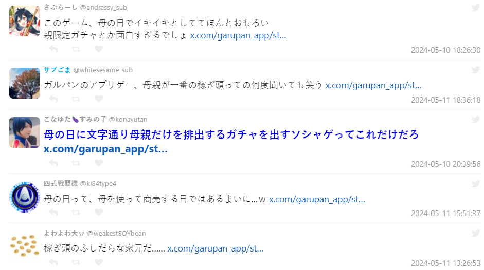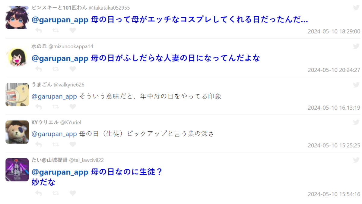 玩家們也嘲笑說母親節推這個是給色色的媽媽 Cosplay 的節日嗎 ( ? ) 又或是人妻之日。加上由於遊戲抽池名稱都稱作「學生」( 生徒 ),兩位女兒都上高中的媽媽怎麼能這麼融入在其中 www。