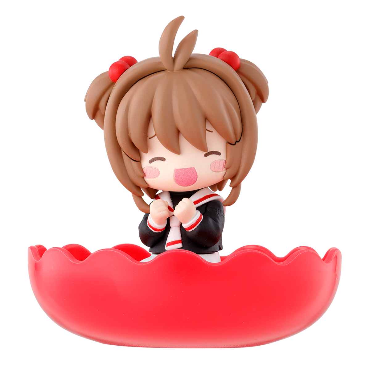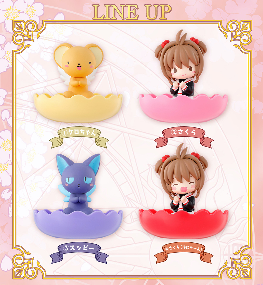本次的庫洛魔法使人偶珠寶架(ジェムリーズ)將三位角色——小櫻、小可以及斯比製作成了四款造型的珠寶架,商品整體高度約為 7 公分,人偶高度約 5 公分,每款整體底部皆作有一個以蛋殼下半部分製作,對應角色顏色的底盤,可以讓各位用來收納珠寶及文具等各類小物,把蛋殼的透明蓋蓋上也相當可愛,更不怕裡面的東西不見!這次的四款造型配率小可和斯比各是 33.3%,普通版小櫻是 26.7%,而「哇~」表情的小櫻則是只有 6.7%,想要湊齊整套的玩具人可能得要試試自己的手氣了!