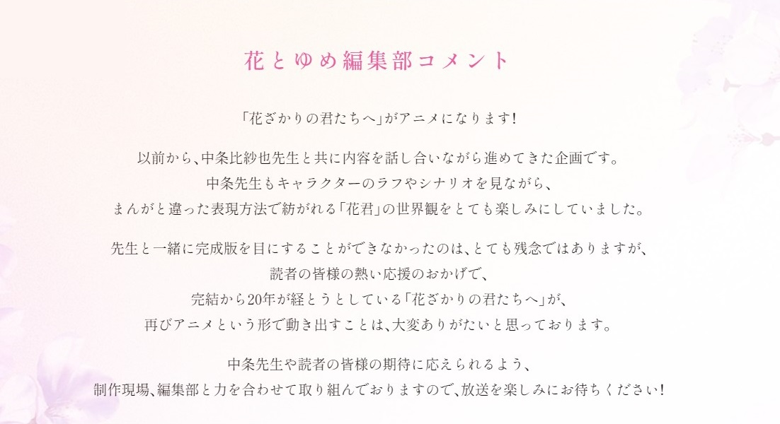 可以想見完結約 20 年,各地都翻拍過真人電視劇,卻從未製作呈動畫版本。這次終於確定動畫的企劃,當時連載的《花與夢》編輯部也對此發表感言,其實以前就和中條比紗也老師一起討論類似的企劃,當時也想用不同的方式呈現這部作品的世界觀。