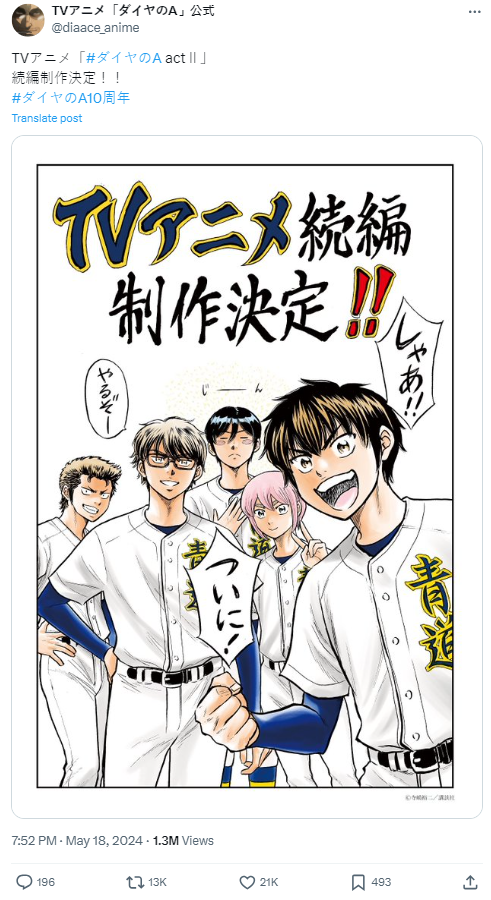 昨日 ( 5/18 ) 官方宣布,先前播出的第三季動畫《鑽石王牌 act2》,確定將製作動畫續篇,正式展開第四季,不過目前尚未公部開播日期。