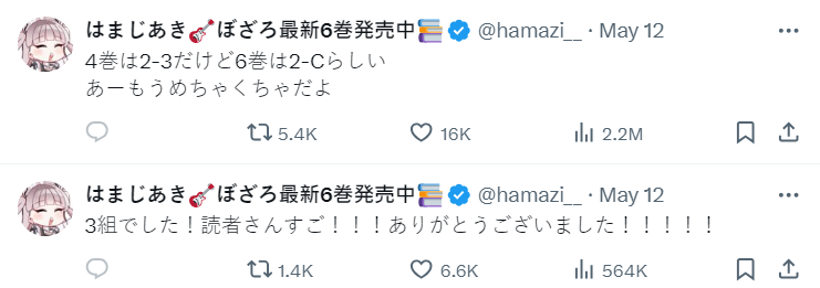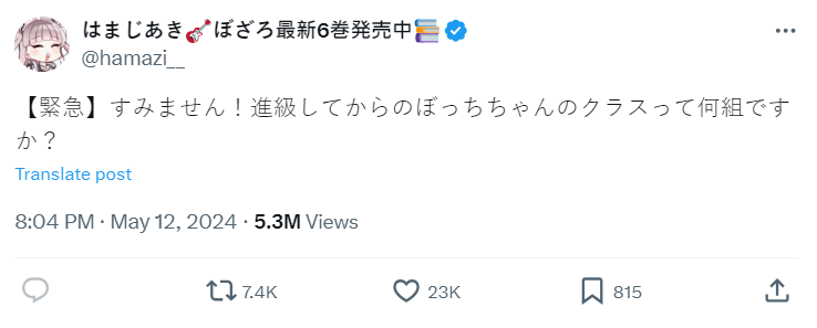 事情是這樣的,作者濱路晶在前陣子在 X 上發文,還特別標示【緊急】,詢問說小孤獨後藤一里升上二年級後,到底是哪一班的...?