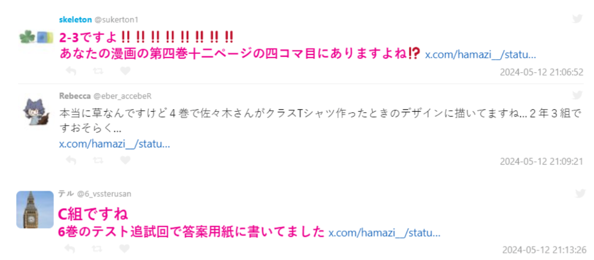 雖說粉絲也尋找漫畫後給出正確答案,卻發現單行本第四集跟第六集寫的答案不一樣,一個寫 2-3,另一個則是 2 年 C 組,原來漫畫中本來就搞錯不相符了 www。