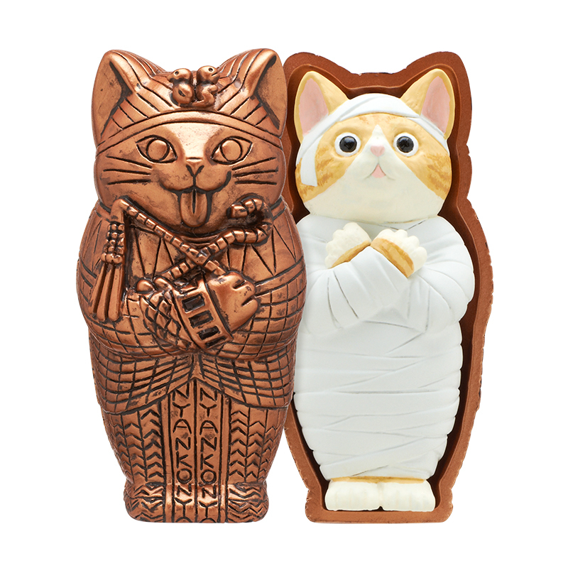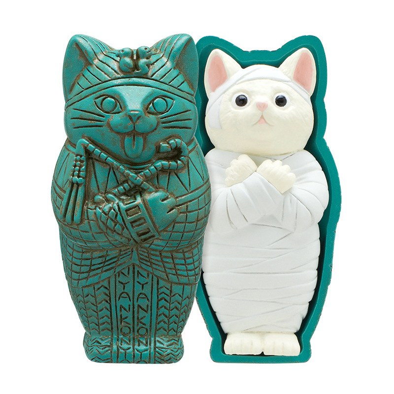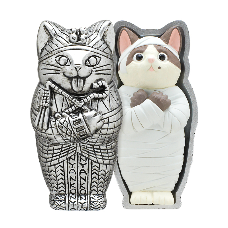 裝在貓形棺材裡的「奇譚俱樂部 木乃伊貓咪」轉蛋登場!雖然是神祕恐怖的木乃伊主題,但打開精緻雕刻的棺木後,裡面躺著的是睜著圓圓大眼、身材豐滿微胖的可愛貓咪!收錄有金×三花貓、銀×小八貓、銅×虎斑貓、青銅色×白貓、象牙色×灰貓,萌萌的小手交叉於胸前,並有全身包著繃帶的細節;棺木更是施以充滿歷史年代感的塗裝,還可以直立擺放,展示和把玩都超有趣~
