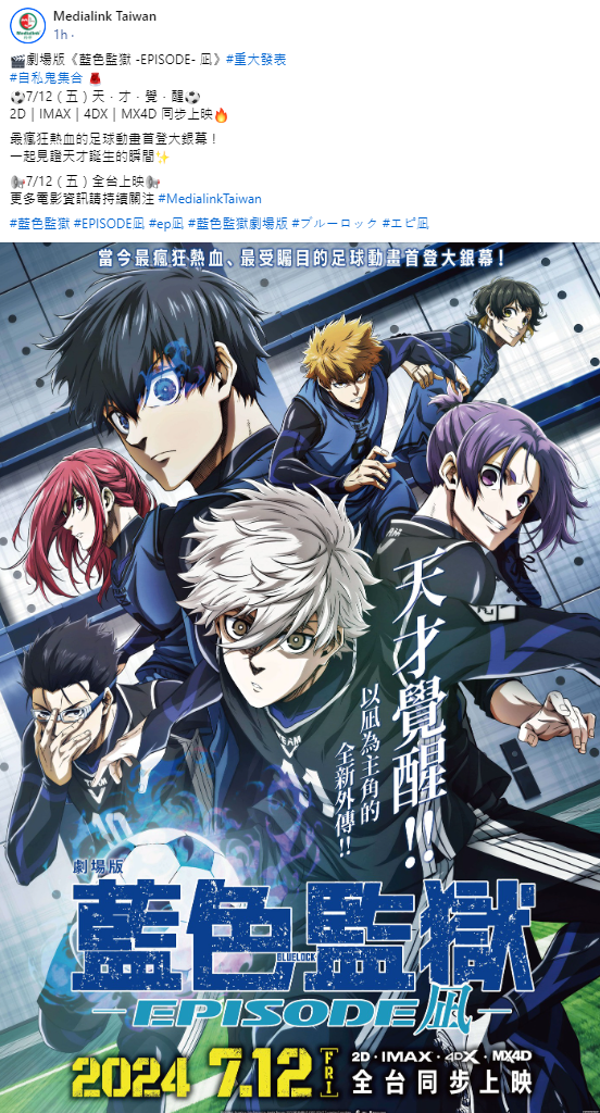 今日 ( 5/20 ) 代理商玲邦 Medialink Taiwan 宣布,劇場版《藍色監獄 EPIOSODE 凪-》 確定將會在台灣上映,時間為 2024 年 7 月 12 日,一般數位版、IMAX、4DX、MX4D 同步推出,讓所有喜愛這部作品的粉絲能到戲院欣賞。