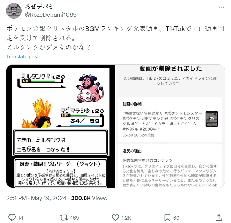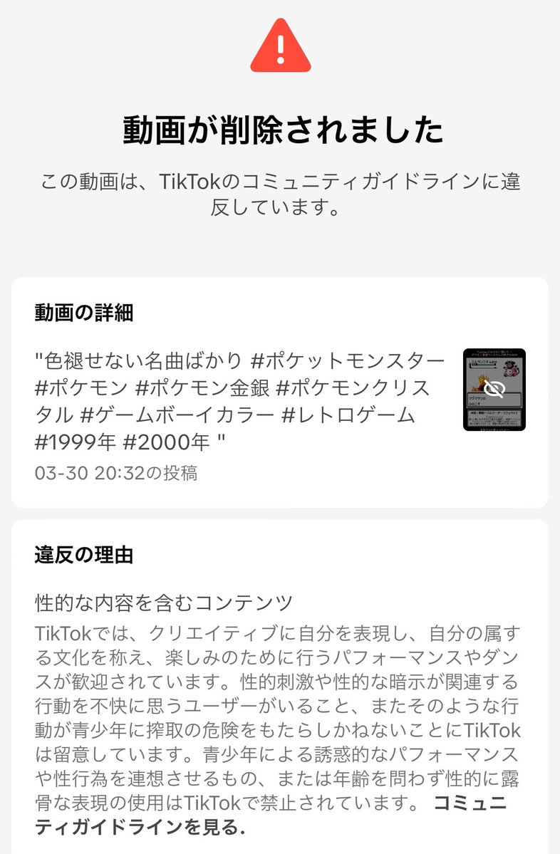 不過今日 ( 5 / 20 ) 日本一位推主ろぜデパミ ( @RozeDepami1085 ) 表示,自己在 TikTok 上傳的影片因「含有性的內容」遭到下架,讓它百思不得其解的是,這部影片只是「《寶可夢 金/銀/水晶》懷舊 BGM」而已,到底為何呢 ?