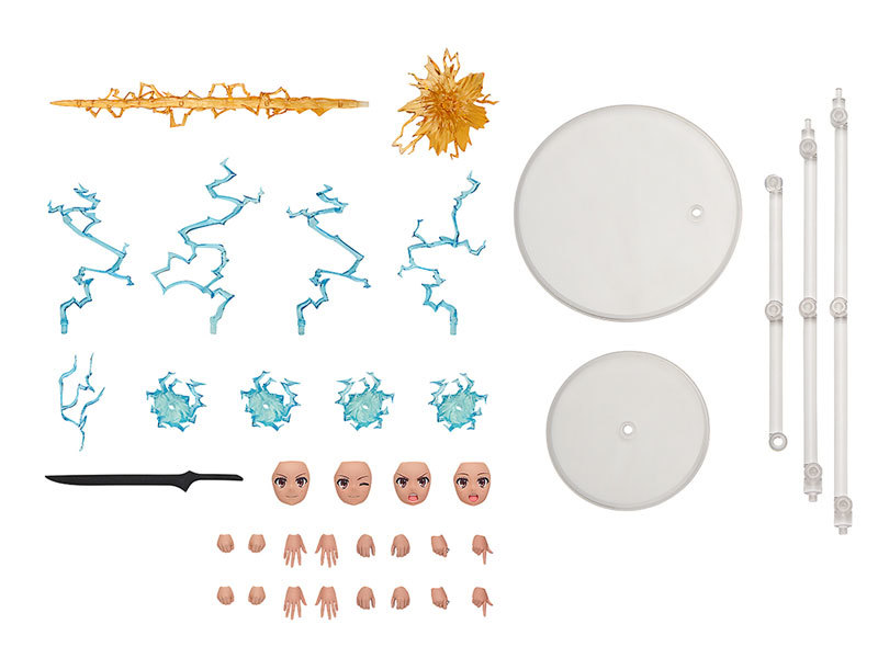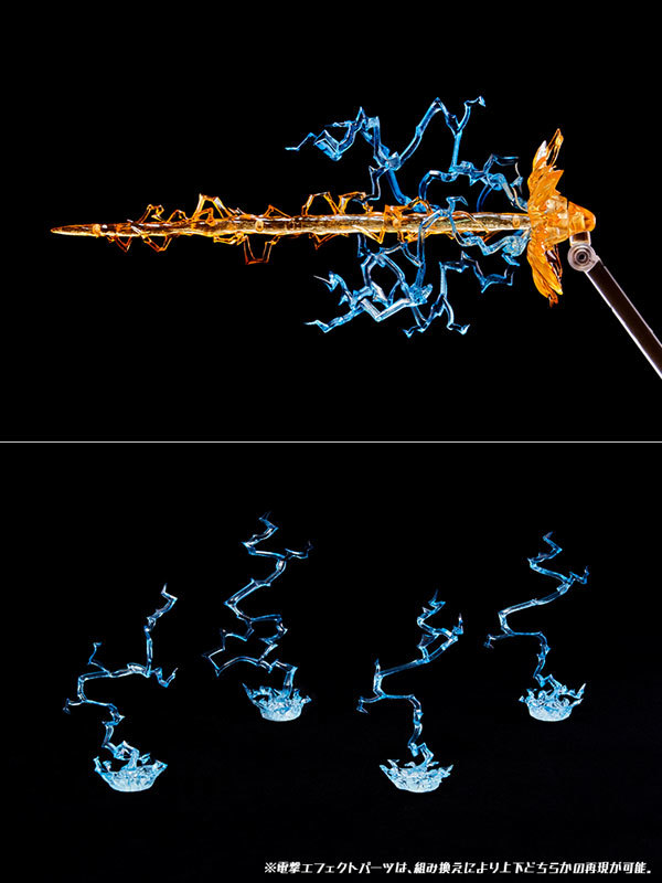 配件部分更包含台座、支架、5 對造型手掌、砂鐵劍以及再現其超能力的「電擊」、「超電磁砲」、等特效零件,於 KADOKAWA 旗下電商網站購入更能獲得「電擊特效 PET 膠片」、「放電地面 PET 膠片」,各自搭配就能夠再現劇中各種帥氣招式場景!