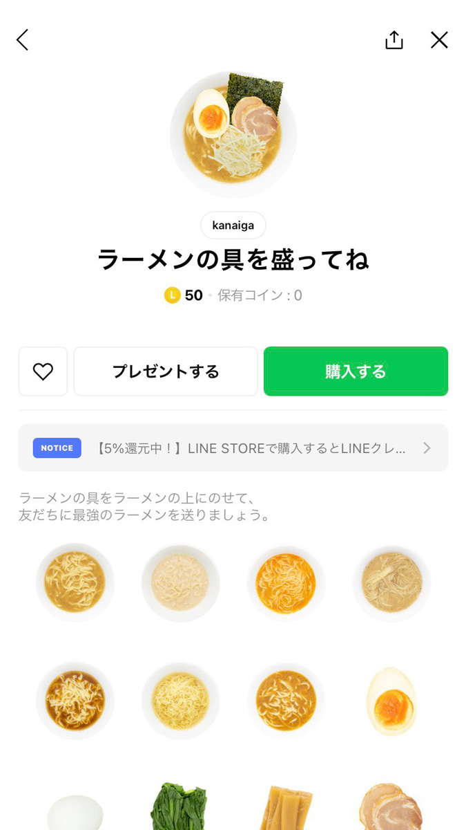 網友們對此舉驚呼「天才!」、「可以根據自己口味拼貼不同拉麵」等評論,現在可以在LINE的官方貼圖小舖買到(僅限日本區域),售價120日元(或50代幣)。