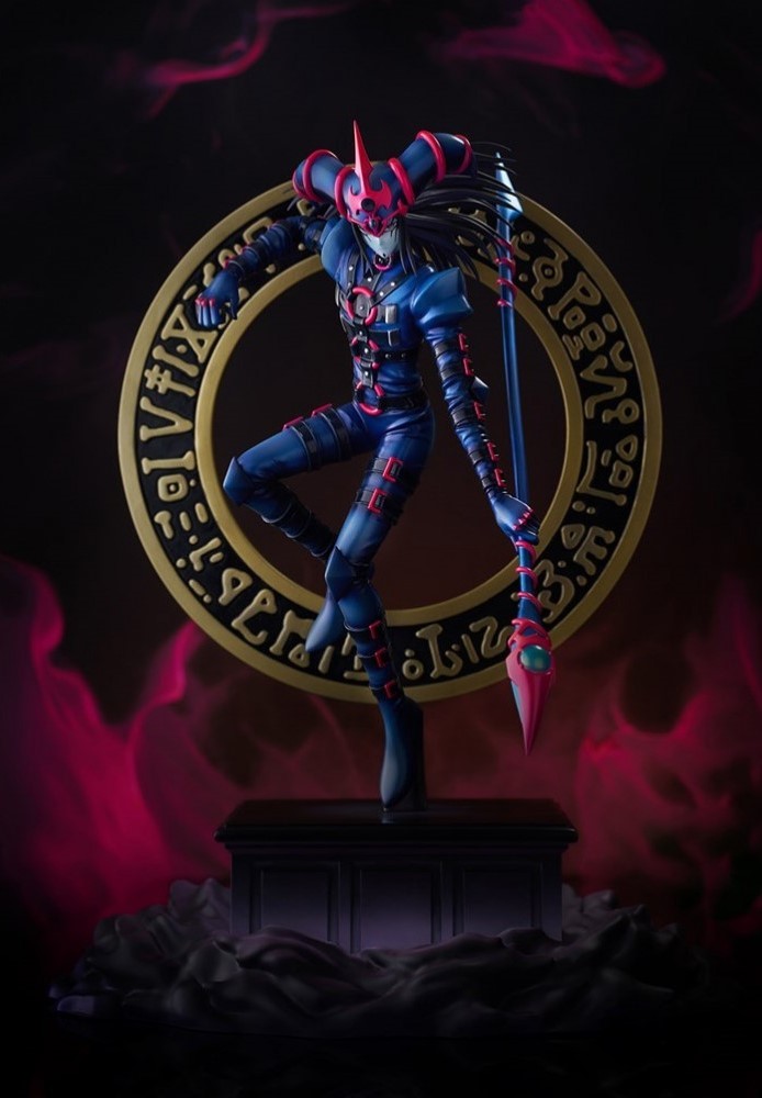 「遊戲王Card Game Monster Figure Collection」系列「混沌的黑魔術師」1/7比例塗裝完成模型,以「毀滅咒文-死亡終極咒」卡牌的插圖設計為靈感,製作為全高約 30 公分的份量尺寸,既易於裝飾又具有高水準的存在感,卡片中看不到的細節也被精確再現!單手握持魔杖,彷彿準備施展開攻勢。細膩刻畫出鎧甲的層次與華麗圖樣,使用鮮豔的亮桃紅色搭配上帶有金屬光澤的紫藍色塗裝,表現出神祕的氛圍。卡片特色的「黑之魔導陣」也被運用在底座造型上,並且可以拆卸,能夠隨心所欲地展示!