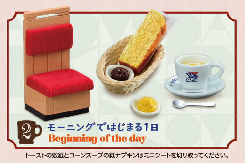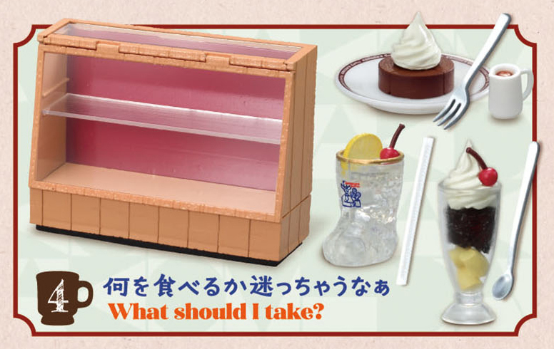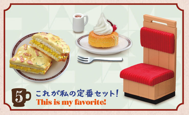 這次的第二彈同樣可以在收齊一整套之後打造出一個雙人座的用餐空間,不過除了椅子的樣式跟前作不同之外,第二彈最大賣點就在於多了一個放餐點模型的精美展示櫃,讓你的客美多咖啡店場景可以更加生動、完整性再提升,超讚的是還有附上一個紳士大叔 KOMEDANDY 的立體人形!與客美多杯子上那位頭戴禮帽、身著西裝、喝著熱騰騰咖啡的紳士圖案相比,這個小小的大叔真的很可愛,那我們就趕快來看一下這次的內容、又收錄了哪些餐點吧。