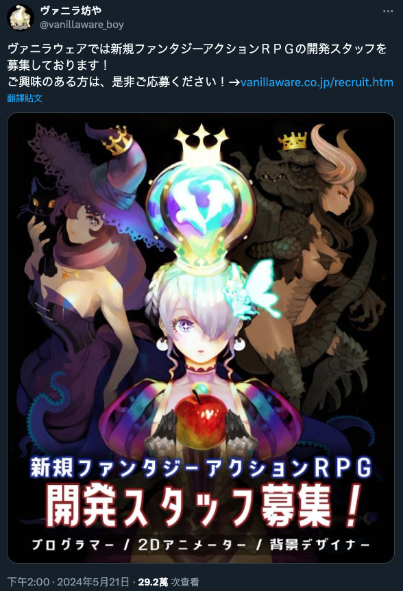 而香草社於今(21)日在官方X帳號「ヴァニラ坊や」貼文,宣布正在招募新作開發團隊,入職者將會製作「新規奇幻動作RPG」。