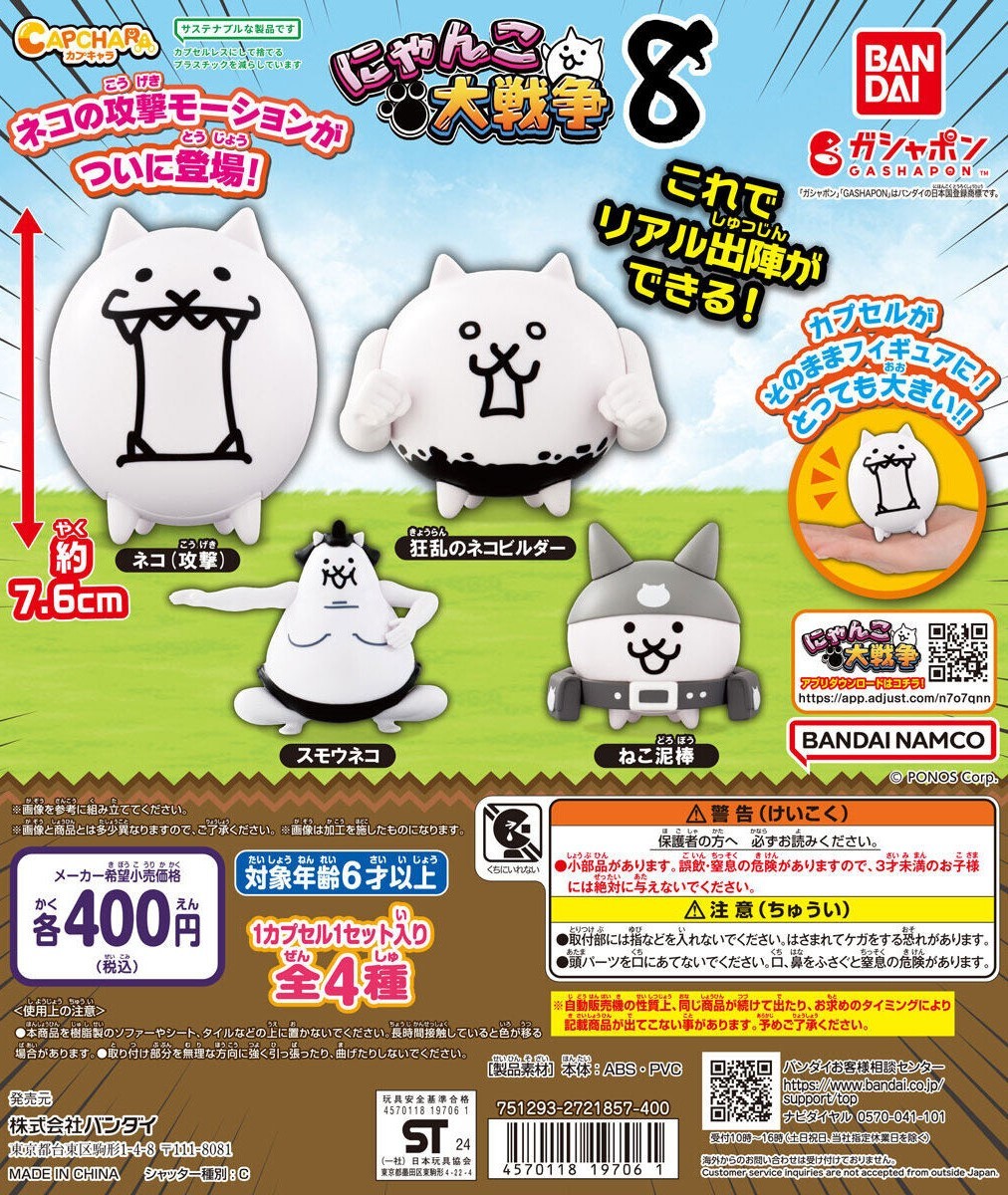 日本萬代玩具公司轉蛋事業部「GASHAPON」旗下將轉蛋殼與玩具結合的「CAPCHARA」系列,以大人氣手遊《貓咪大戰爭》為主題推出最新第八彈「CAPCHARA 貓咪大戰爭8」環保轉蛋!一共有 4 種款式,每轉參考售價為 400 日圓,於 2024 年 05 月發售。