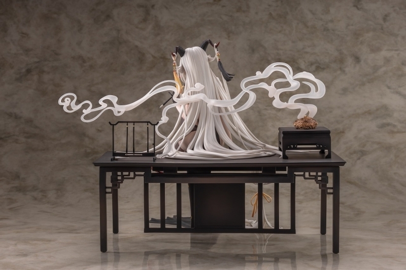 而在這次新年旗袍的造型中,AniGame 也直接做出了整套的木桌場景,讓埃吉爾散落在桌面上、順著桌邊自然垂墜的長髮都得以表現,身旁更是有飄出縷縷白煙、施以精緻雕刻的香爐,可在埃吉爾本體的肌膚、頭髮、旗袍布料......等部分並沒有凸顯質地差異的精美塗裝,個人認為整體視覺效果略平,希望實體表現會更有層次。