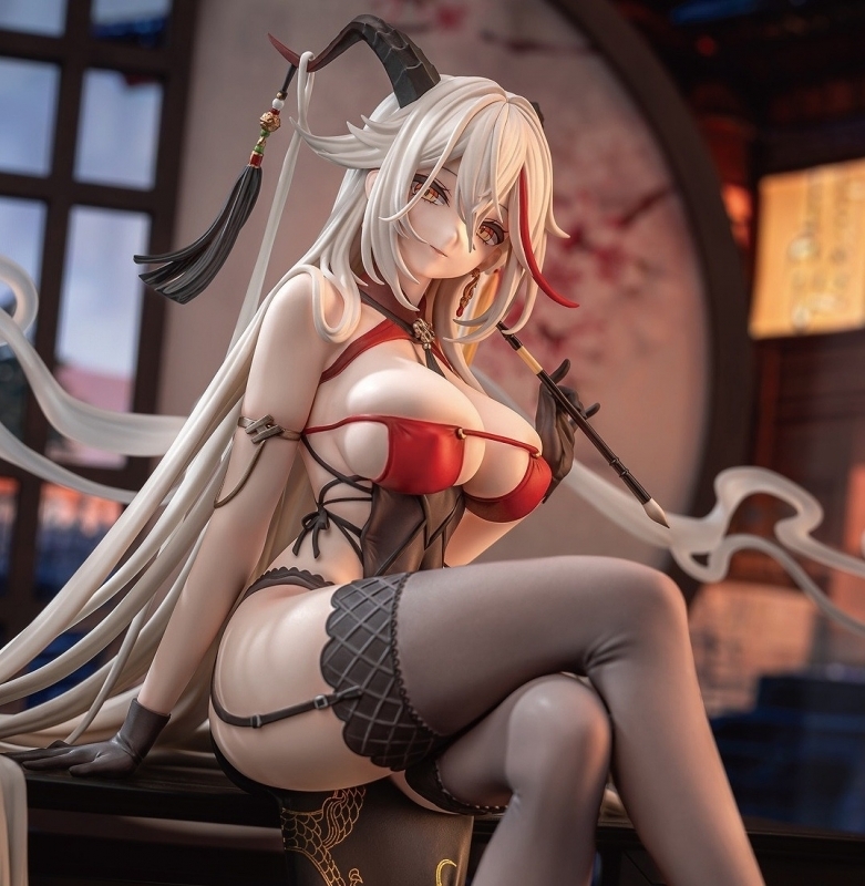 埃吉爾,是隸屬於鐵血陣營的 DR(決戰方案)超級巡洋艦(超巡),是必須在開發船塢投注大量時間才能建造完成的計畫艦,遊戲預設立繪為頭頂有著龍角、留著白色長髮的色氣巨乳美少女,其名稱正是來自北歐神話中的深海海神埃吉爾(Ægir);本次依照新年旗袍換裝「金龍騰祥雲」打造的埃吉爾高約 22 公分,不僅將那套根本是把幾塊布蓋在身上的極大膽旗袍考究再現,遭到擠壓而變形的巨乳、腹部與黑絲襪的皺褶、埃及爾經典的白色長髮,以及那雙快掉下來的紅色高跟鞋都有很不錯的呈現!