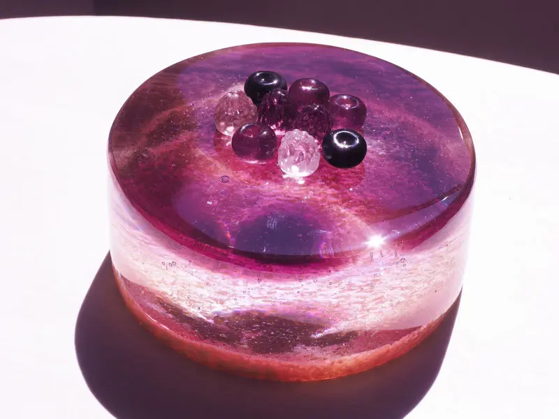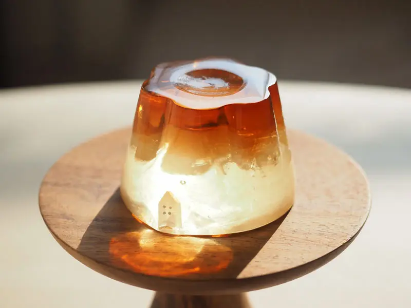 這次的「玻璃布丁」是她用布丁盒來製作的玻璃成品,透過漸層的效果,展現出真實布丁有著不同的美感,在裡面還藏有一個以「光之城」為概念的景色,布丁的顏色就彷彿是黃昏般的場景,呈現出非凡的景色。