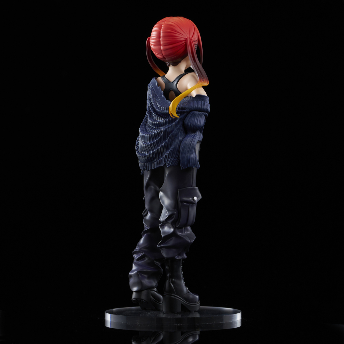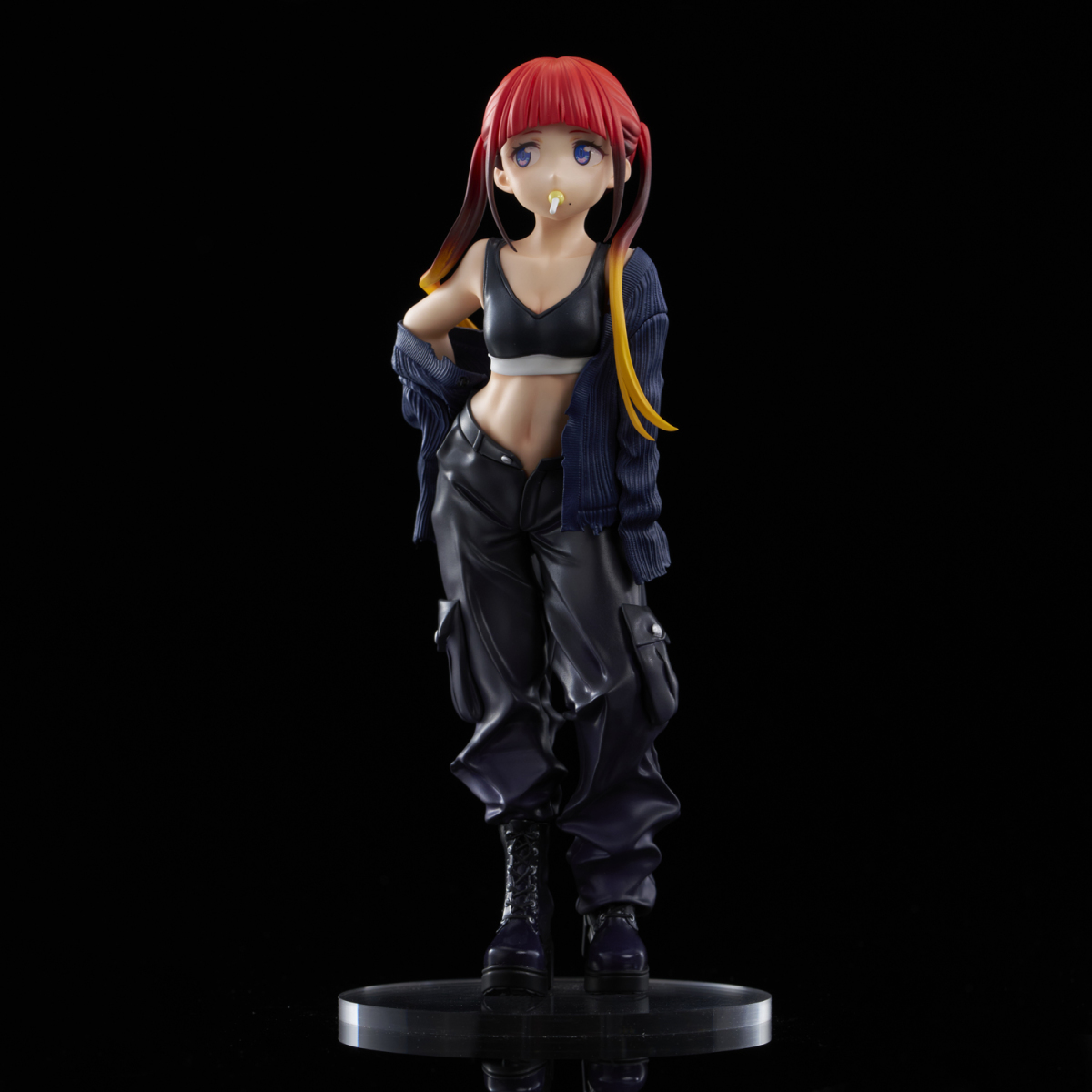 「GRIDMAN UNIVERSE ZOZO BLACK COLLECTION 飛鳥川千瀨」無比利模型,尺寸約高 20.5 公分,將結合 ZOZOTOWN 品牌形象的黑色調原創服裝立體化,酷酷的街頭風格呈現出與平常可愛形象截然不同的時尚魅力!深色系的運動內衣大膽露出精瘦的身軀,腹部的肌肉線條、鎖骨等處施以柔和的肌膚塗裝強調陰影,針織的外套紋理再現服裝的不同質感;俐落的工作褲搭配中筒靴相當帥氣,咬著棒棒糖的表情也很可愛!