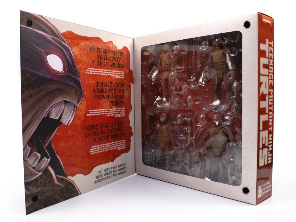包裝部分採用開窗形式,讓各位玩具人可以一窺商品的內容,盒繪部分特別繪製出了四隻烏龜的殭屍造形,打開後內側李奧納多眼睛發著紅光、張大嘴巴的插圖十分有魄力!