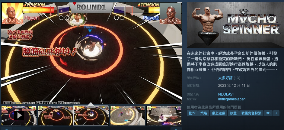 不只是肌肉男水族館,他甚至曾經開發過一款叫做「猛漢旋轉者」的遊戲。這款遊戲結合了肌肉男和戰鬥陀螺,但最可怕的是它steam商店頁面的說明⋯⋯「在未來的社會中,經濟成長孕育出新的價值觀,引發了一場消除悲哀和衝突的新戰鬥。 男性鍛鍊身體,透過將下半身改造成圓錐形進行高速旋轉,以傲人的肌肉相互碰撞。 他們的戰鬥正在改寫世界的法則───。」