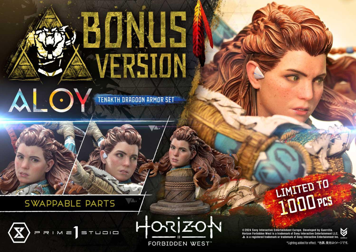 日本玩具品牌Prime 1 Studio旗下的雕像系列「Ultimate Premium MasterLine」,將推出在PlayStation 5上推出的著名動作遊戲《地平線:西域禁地》(Horizon Forbidden West)中,主角亞蘿伊(ALOY)身著遊戲中的特殊套裝「提那科重騎兵套裝」(Tenakth Dragoon Armor Set)的版本造型之立體人形雕像!預定在2025年9月至12月間上市。價格為197,890日圓。