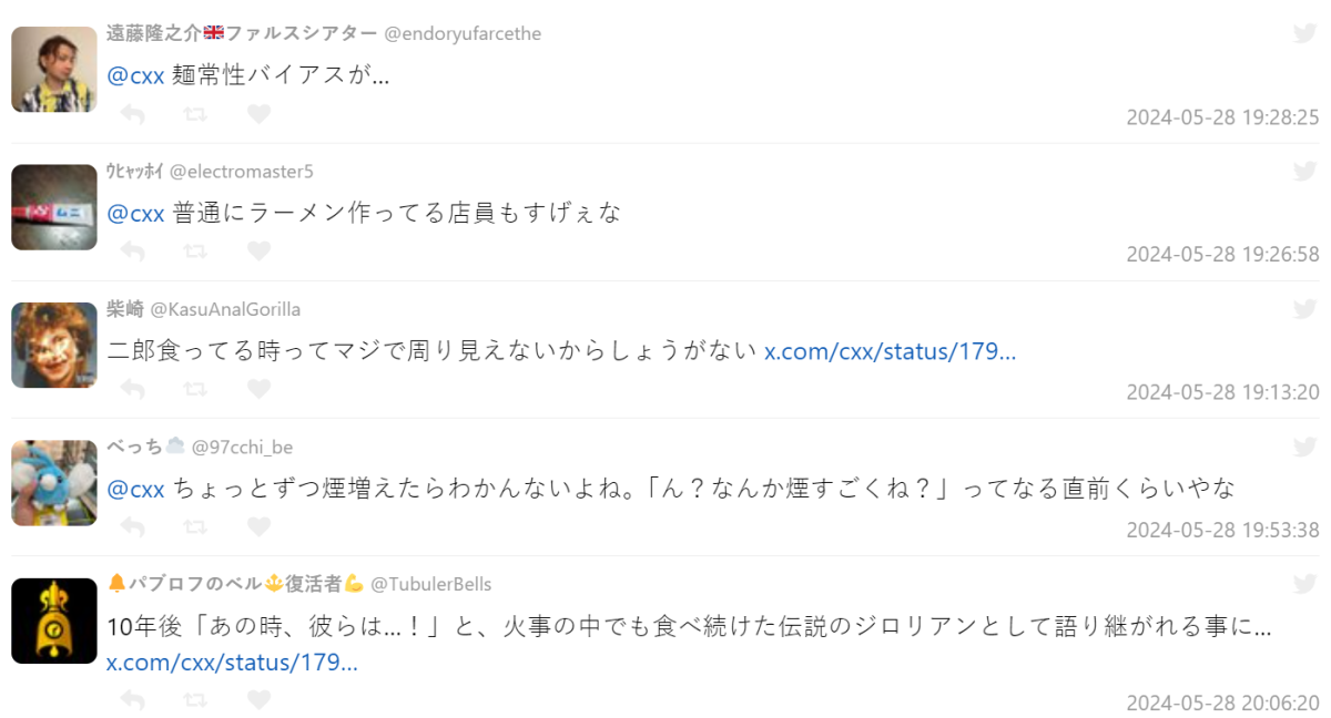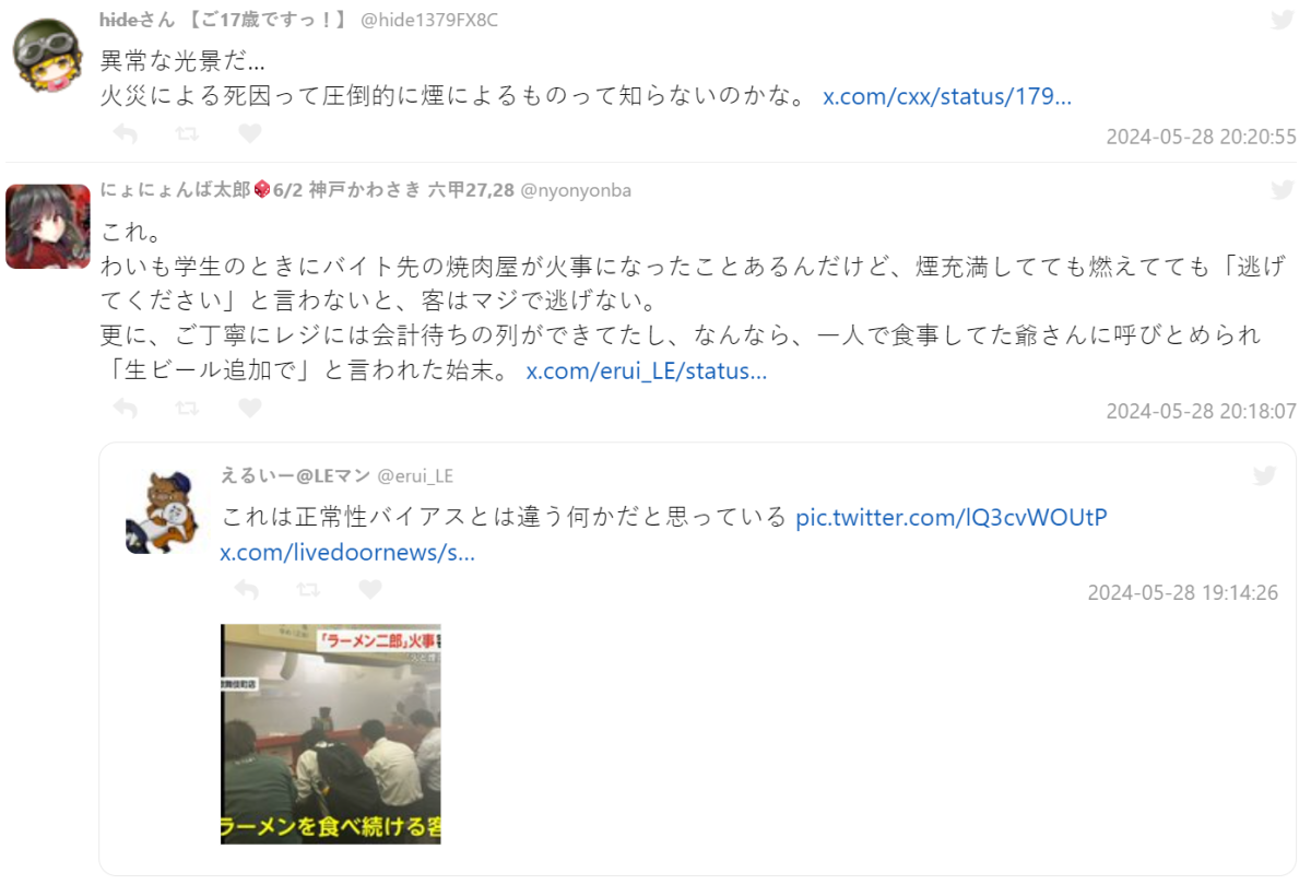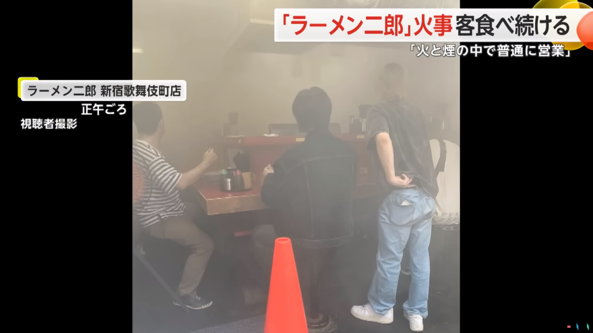 不過近日日本 X 上,一間連鎖拉麵「拉麵二郎」在新宿歌舞伎町的店舖發生火災,卻有現場民眾錄下,火災發生煙霧瀰漫的當下,居然顧客都還坐在位置上用餐,甚至店家也沒有任何動靜,這樣的現象引起網民熱議,到底為何如此 ?