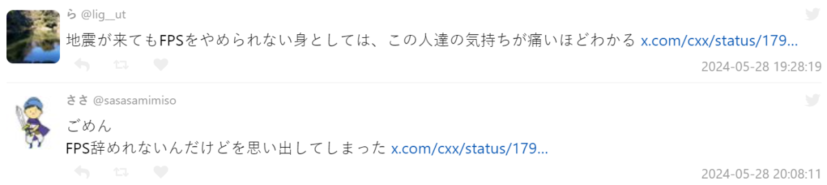也網友表示就像第一人稱射擊遊戲(簡稱FPS)一樣,就算地震來了也要繼續玩下去,似乎跟吃二郎拉麵雷同 XD。
