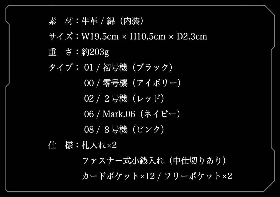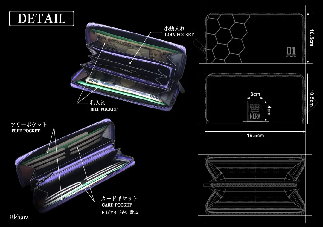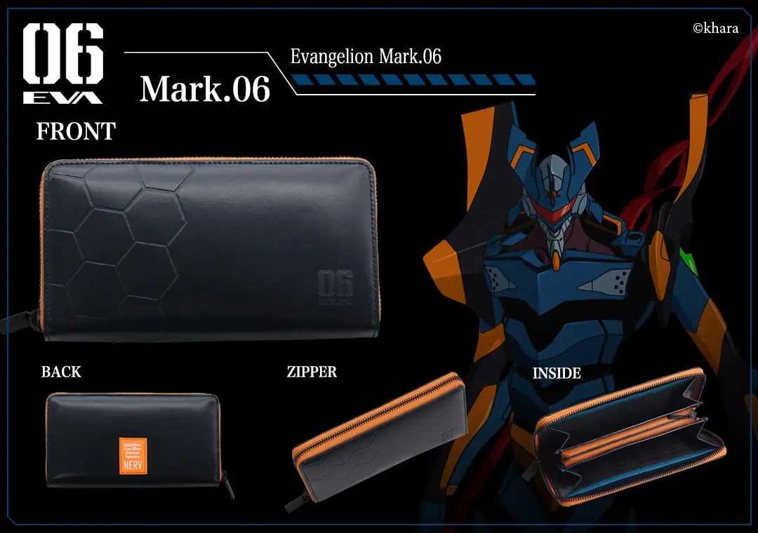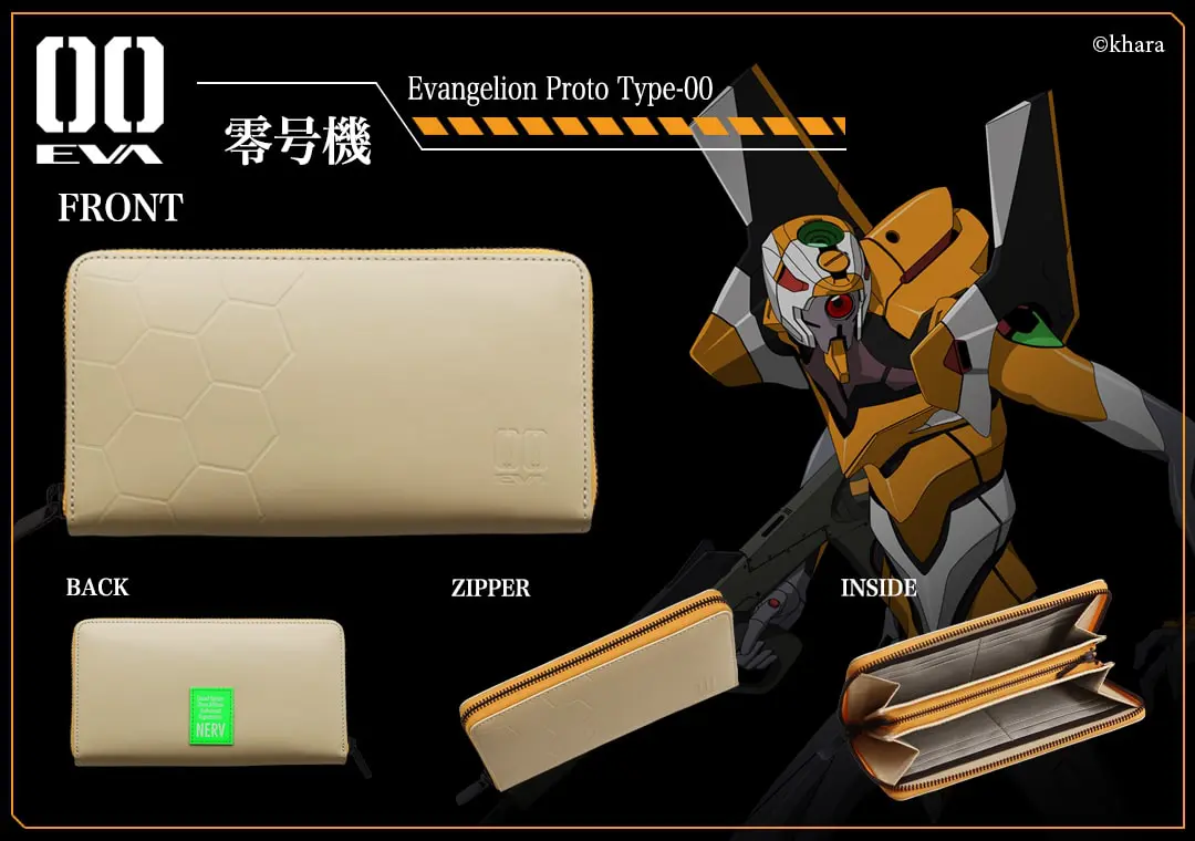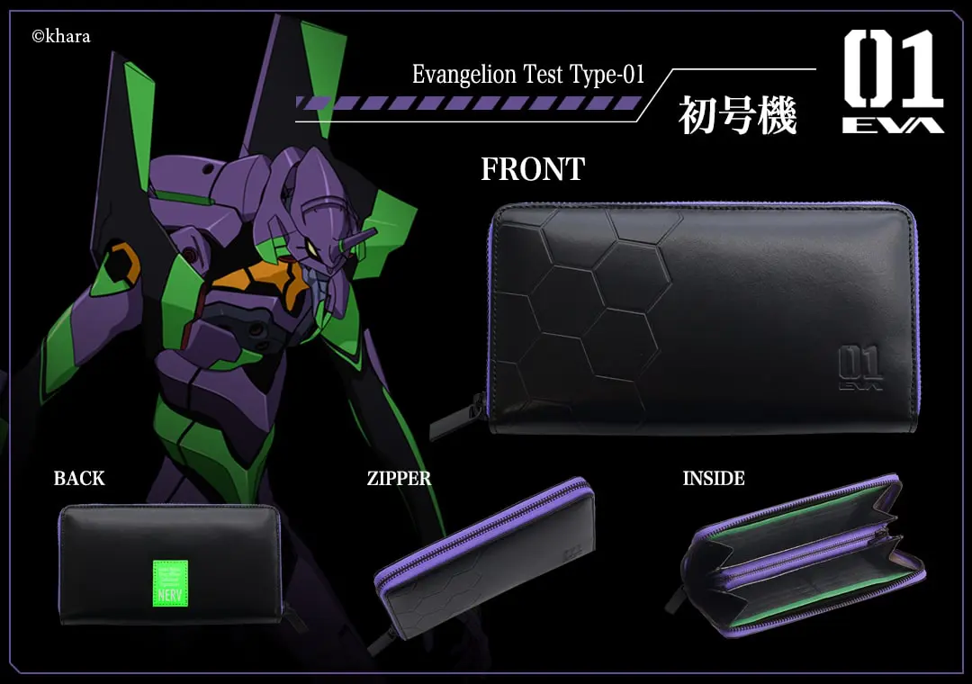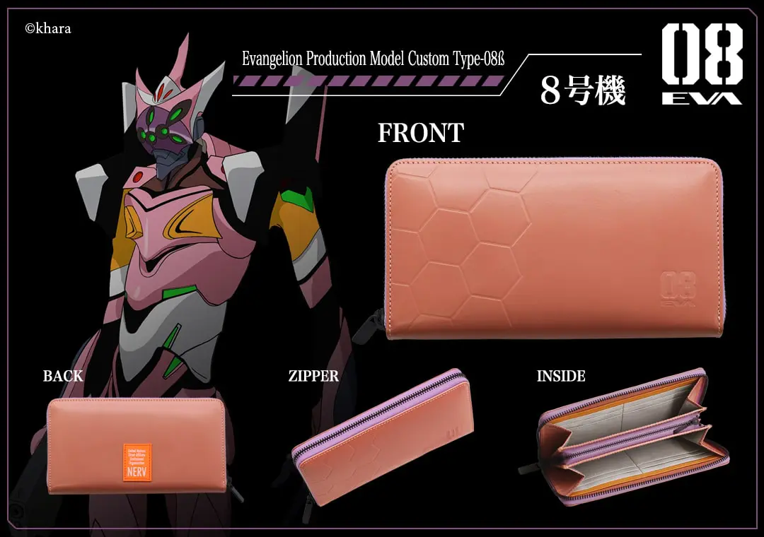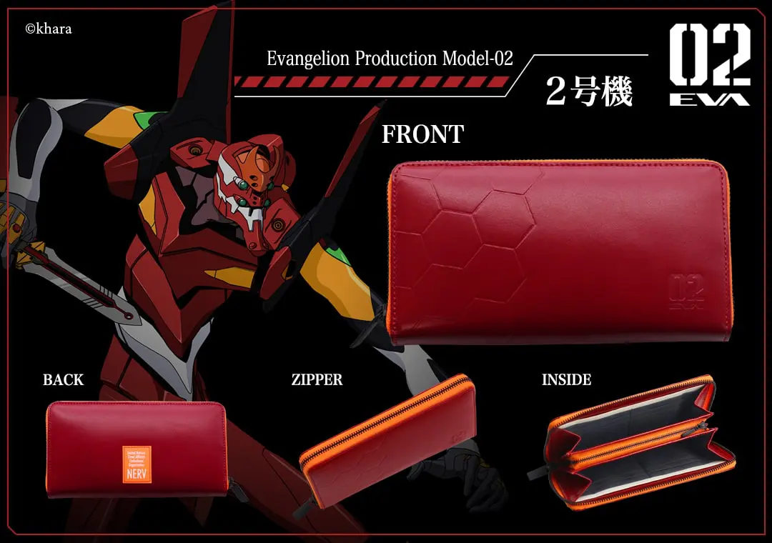 本次合作推出包含 : 初號機、二號機、零號機、八號機以及 Mark. 06 為主題的長夾款式,為了營造 EVA 的氛圍,選擇了有光澤且堅硬的真皮來製作。 《新世紀福音戰士》的世界觀可以從長夾的配色,AT 力場 & 各號機標誌的鋼印呈現。