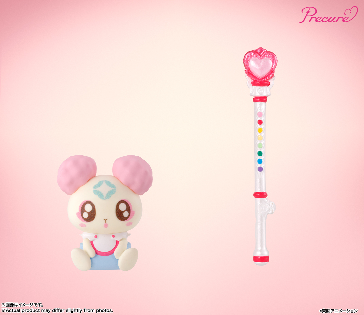 本次商品高約 13.5 公分,根據角色設計師繪製的插圖進行製作,在整體造型上都做了更新與修正,還原雙馬尾的浮誇比例並細緻的刻畫了桃天使服裝上花邊及各種裝飾的細節,展現出她活潑可愛的魅力!本次的配件部分也附上了「希馮(シフォン)」的角色模型以及在劇中使用的「七彩魔法棒」,能夠與桃天使人偶互動把玩!此外,這次的底座也與「夢天使(キュアドリーム)角色設計師版」一樣,特別製作為心形的造型,並印製了角色設計師版本的圖樣,大幅提高擺設的質感!