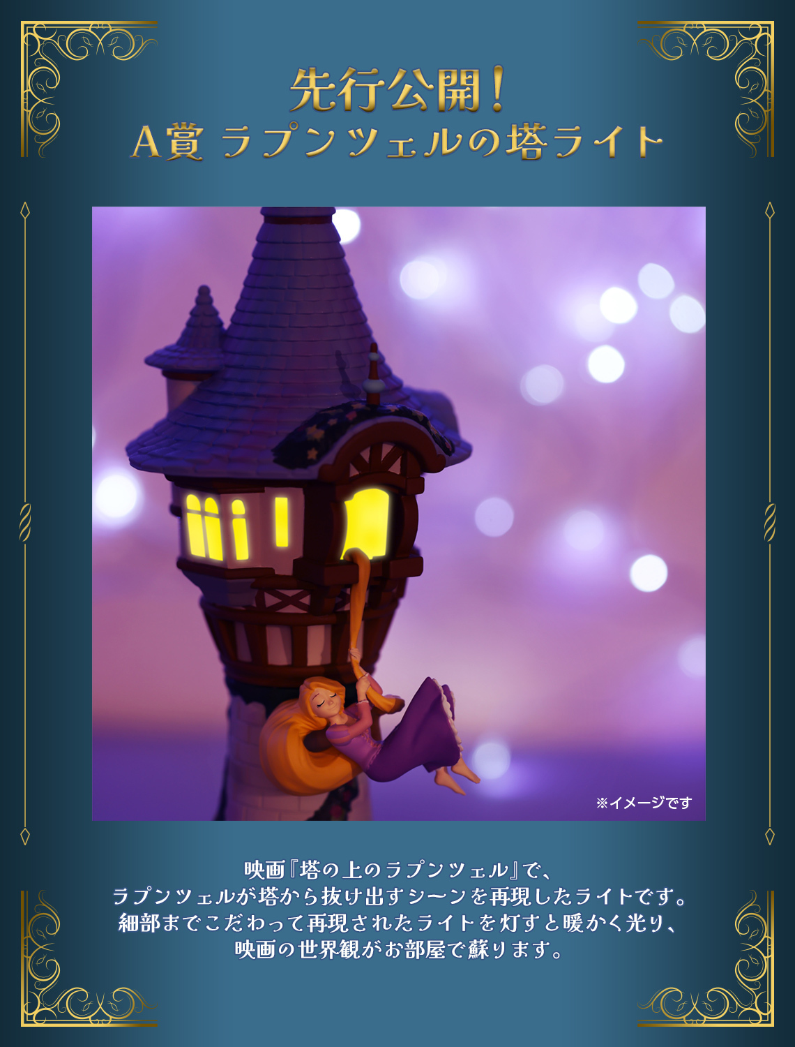 本次的「迪士尼 Dreaming Celebration」將以眾多迪士尼角色為主題,收錄SP、A~G、最後一賞以及雙重中獎賞等多種級別賞品,而目前也搶先公開了 A 賞及雙重中獎賞的樂佩公主高塔夜燈,呈現樂佩懸掛在高塔側邊的樣子,從窗戶裡透出的黃光散發出溫暖的氛圍!