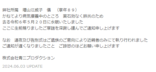 在今日(6/3)由聲優事務所「青二Production」宣布,曾為該系列的女性主要角色「峰不二子」配音的日本知名女性聲優增山江威子已於5月20日因肺炎去世,享壽89歲。