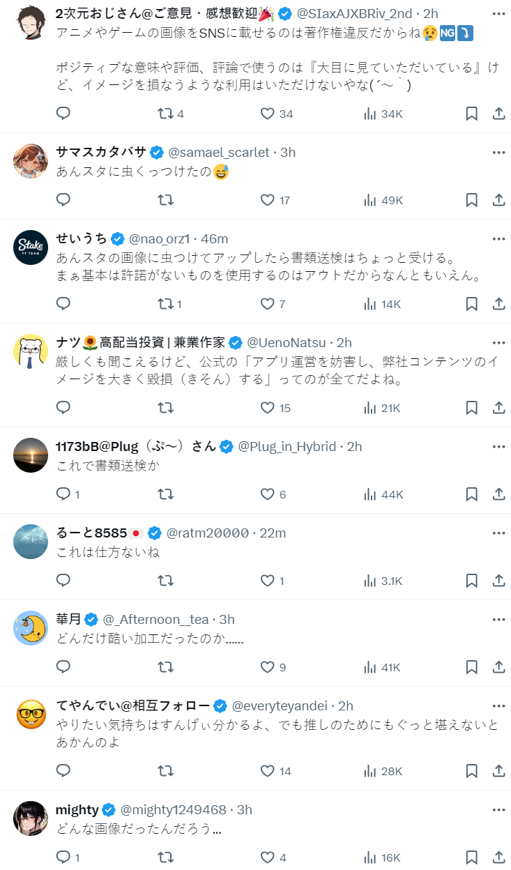 根據每日新聞報導指出,該名女子在 2023 年 1 月,將昆蟲的圖片貼到遊戲中出現的角色上,加工後藉由 X 上面傳播。雖未表明意圖,但後續被營運方注意到,官方以「以讓人不愉快且毀壞角色形象的方式惡意改圖,想透過如此不舒服且恐懼感來阻礙遊戲的營運,嚴重毀壞遊戲的形象。」,向警方提出刑事訴訟。