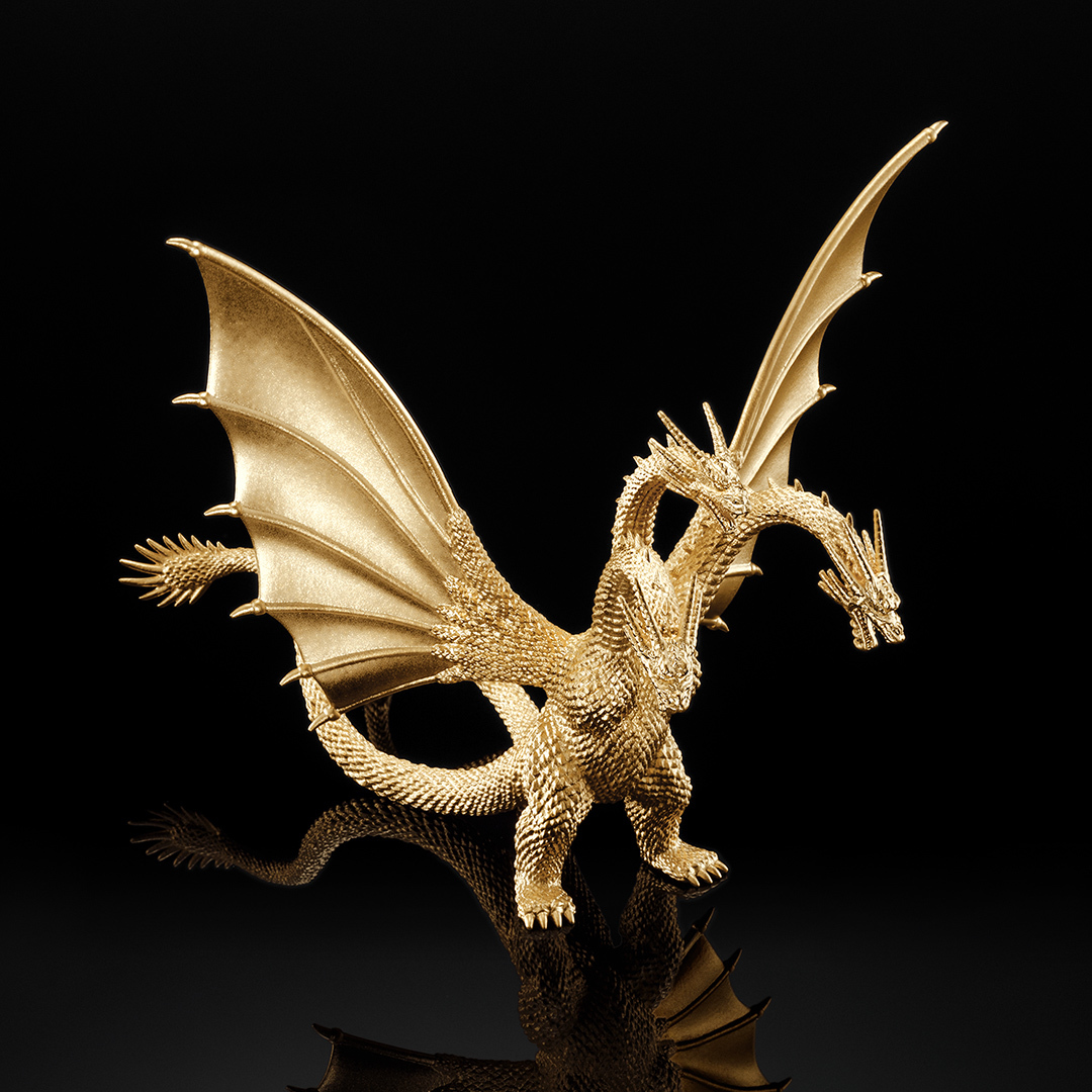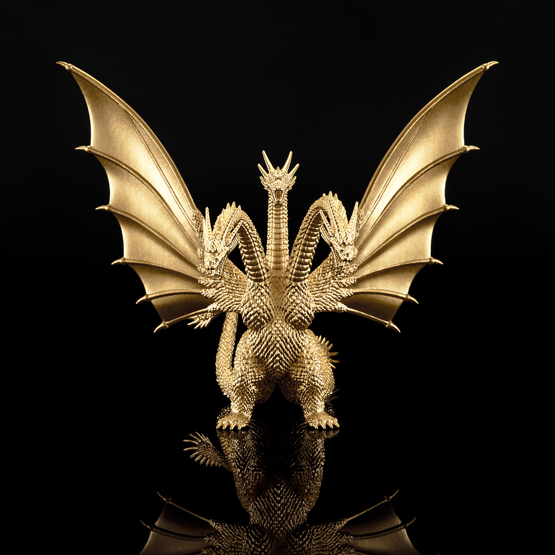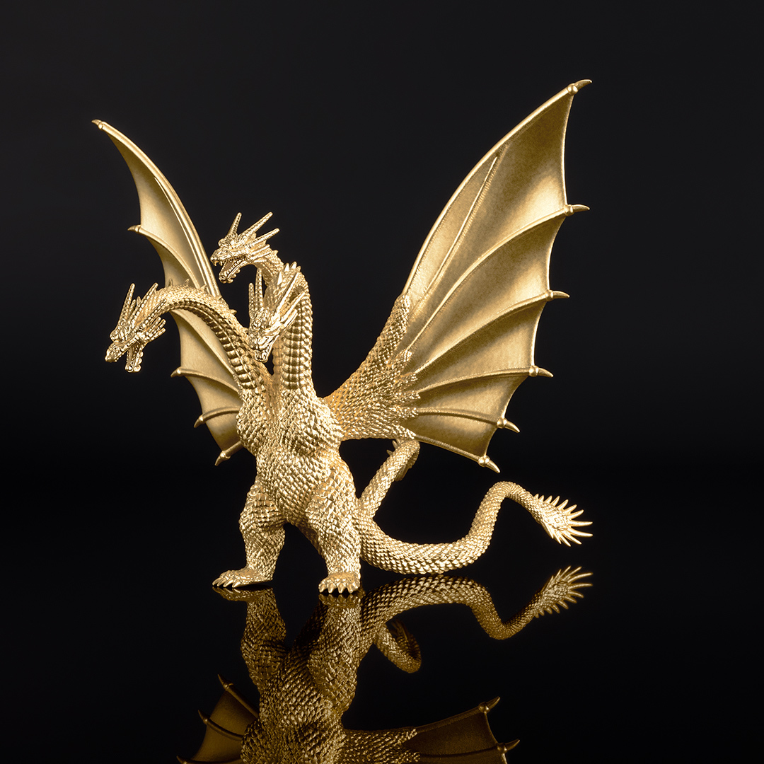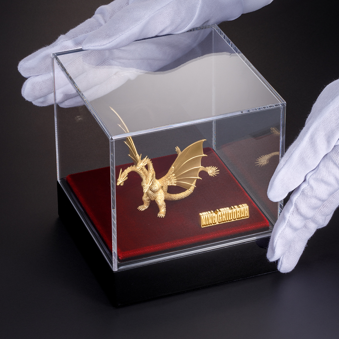雖說是紀念 1954 年的系列首部電影《哥吉拉》,但可能擔心與先前推出的「哥吉拉-1.0 18K黃金/銀製模型」過於相似,本次的商品選擇以 1991 年電影《哥吉拉 vs 王者基多拉》中的王者基多拉為原型打造。商品高約 8.2 公分,採用奢華的 18K 黃金以及 925 純銀鑄造,兩款在造型上無明顯差異(但在價格上差很多),還原基多拉身上佈滿鱗片的造型,金屬色的呈現凸顯了基多拉滿身黃金鱗片的強大魄力!每款皆會附上 925 銀製成、寫有「KING GHIDORAH」的銘牌,並附上專屬的展示盒,讓各位玩具人能夠好好展示這高貴奢華的浮誇收藏!