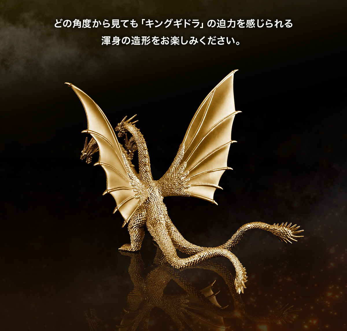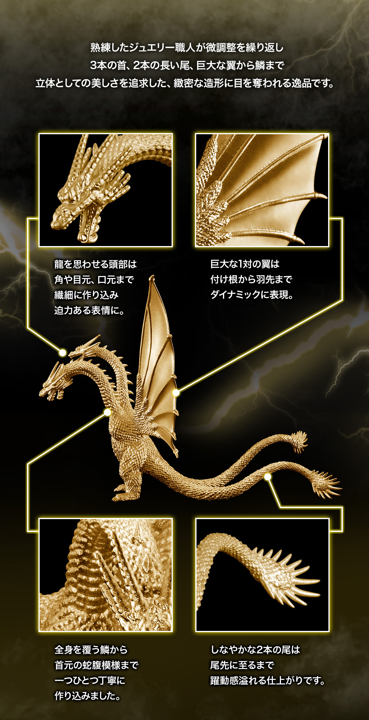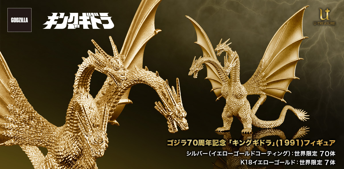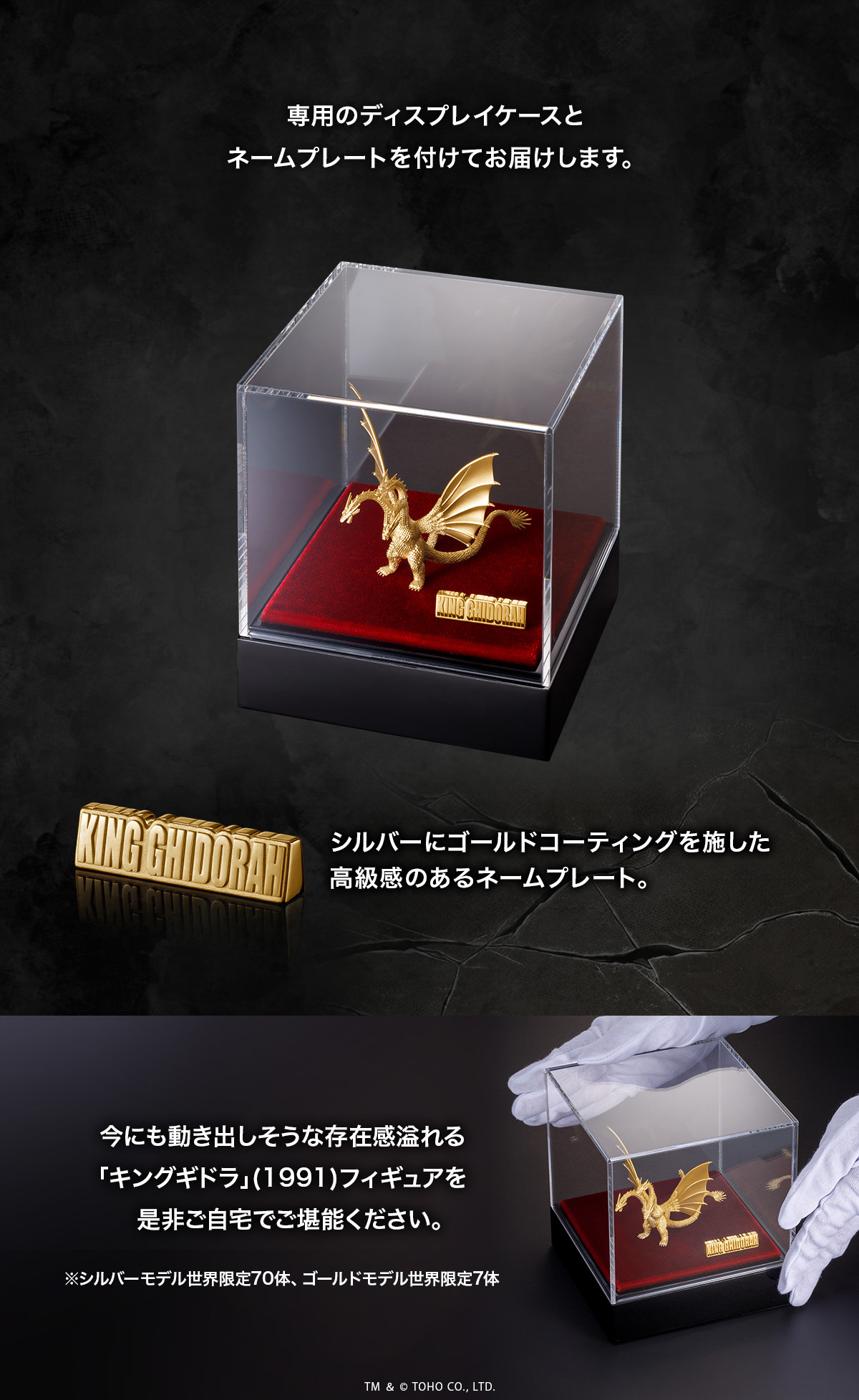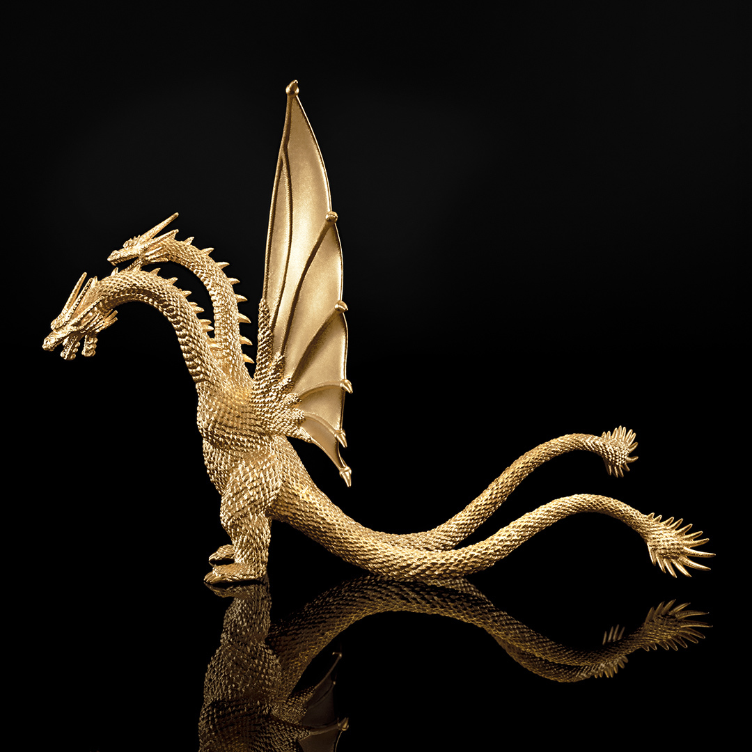 雖說是紀念 1954 年的系列首部電影《哥吉拉》,但可能擔心與先前推出的「哥吉拉-1.0 18K黃金/銀製模型」過於相似,本次的商品選擇以 1991 年電影《哥吉拉 vs 王者基多拉》中的王者基多拉為原型打造。商品高約 8.2 公分,採用奢華的 18K 黃金以及 925 純銀鑄造,兩款在造型上無明顯差異(但在價格上差很多),還原基多拉身上佈滿鱗片的造型,金屬色的呈現凸顯了基多拉滿身黃金鱗片的強大魄力!每款皆會附上 925 銀製成、寫有「KING GHIDORAH」的銘牌,並附上專屬的展示盒,讓各位玩具人能夠好好展示這高貴奢華的浮誇收藏!