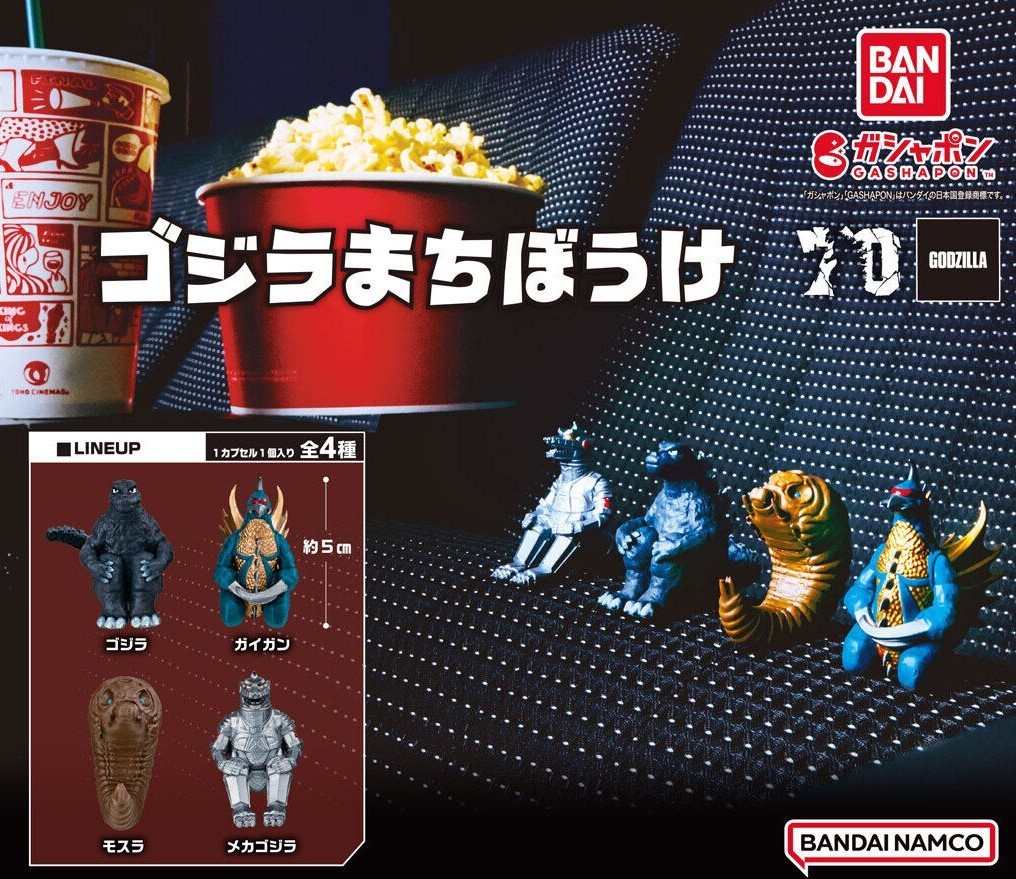 維持「等待中系列」一貫的風格,讓角色流露出的苦苦守候、淡淡哀愁感,這次的『等待中的東寶怪獸 哥吉拉』轉蛋,將哥吉拉系列的人氣怪獸:摩斯拉、哥吉拉、蓋剛、機械哥吉拉以轉蛋小尺寸可愛重現,並且搭配不同角色性格而有不同的坐姿,包含摩斯拉幼蟲捲起來的怪異坐姿(?)、小手收放在膝蓋上...展現怪獸們難得一見的乖乖坐姿!還可以帶去電影院一起看怪獸精彩的打鬥場面~