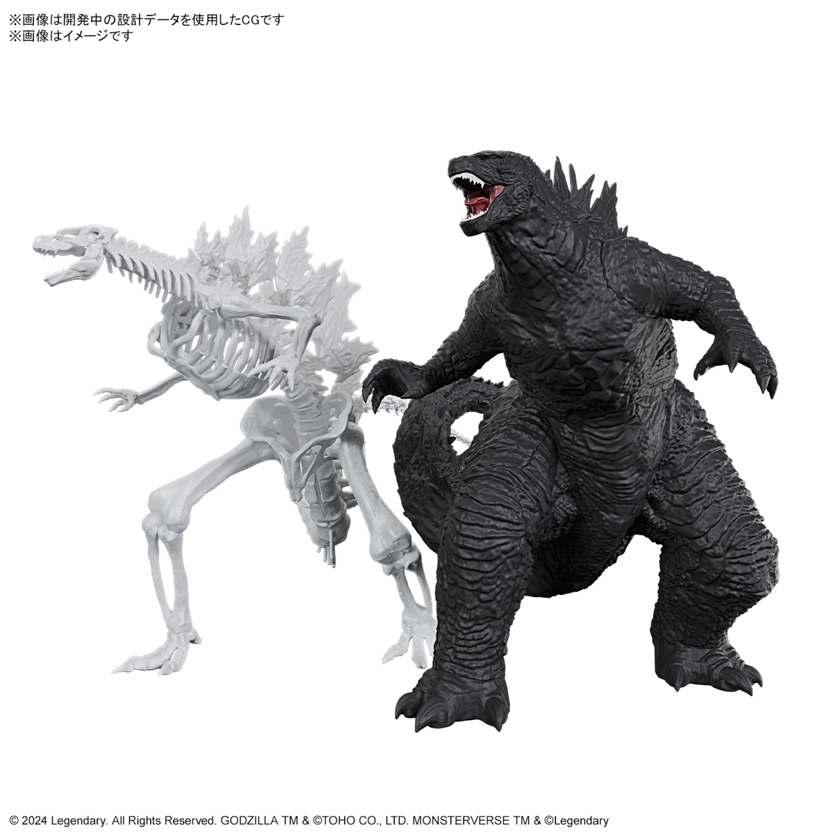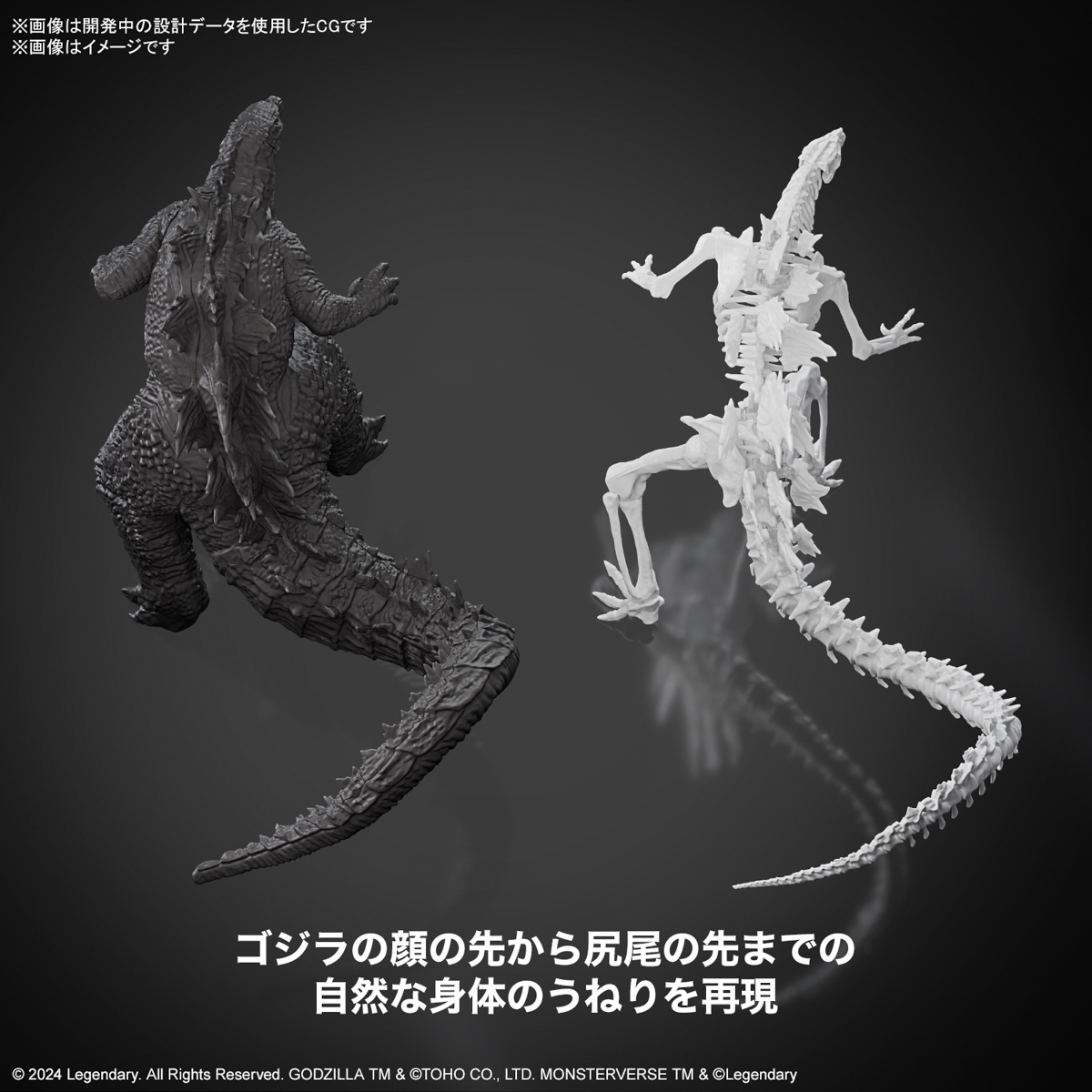 「哥吉拉(2024) from 哥吉拉與金剛:新帝國」組裝模型,運用精密的成形技術還原哥吉拉在劇中的特徵造型,分為獨特的骨骼結構與高密度細節的外皮兩個部分,讓玩家能夠從骨架開始組裝,組裝後全長達 255 mm,再現充滿魄力的萬獸之王!並能依照自己的喜好選擇骨骼包覆在外皮下的完整造型/與外平並列展示的兩種狀態;為了支撐哥吉拉龐大的身體,配有了兩種支撐零件輔助。