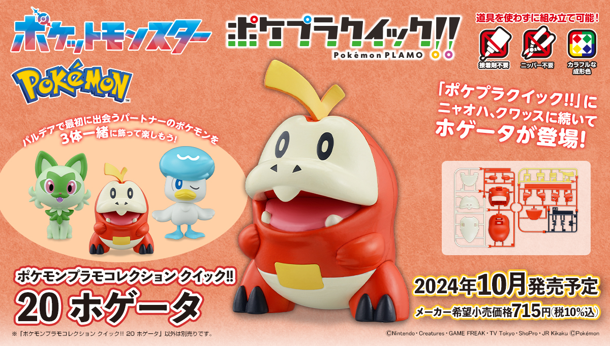 日本 BANDAI SPIRITS 公司 HOBBY 事業部推出的《精靈寶可夢》主題組裝模型 POKEPLA 支線系列「PLAMO 收藏集 快組版!! 」發表了第 20 彈最新作商品:「PLAMO QUICK!! 呆火鱷」,參考售價為 715 日圓,預計於 2024 年 10 月發售。