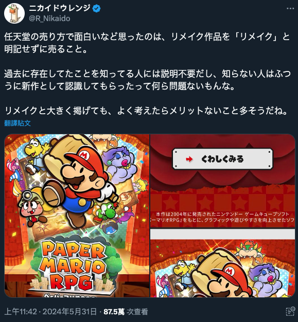新的《紙片瑪利歐RPG》提升了畫面與易玩性,但卻沒有在標題直接寫出類似重製的字樣。X上一位獨立遊戲製作者「ニカイドウレンジ(@R_Nikaido)」,就點出了這件事,並且給予高度讚譽。