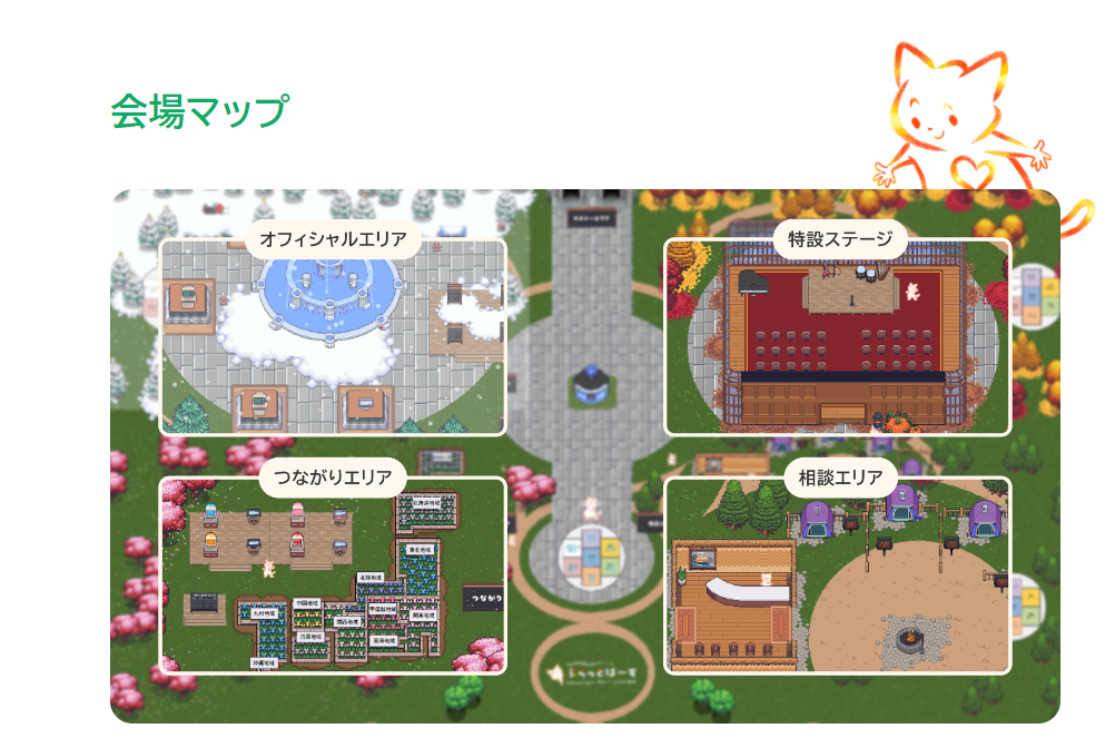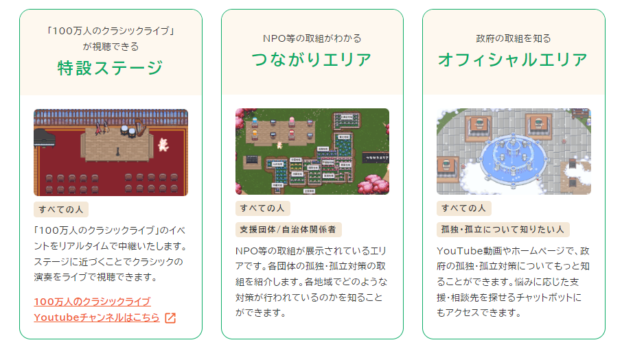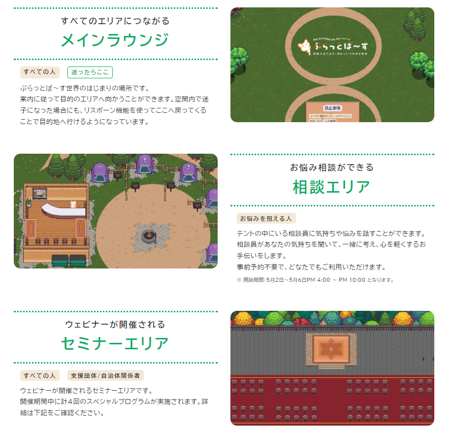 不過根據元宇宙計劃「ぷらっとば~す」官網所介紹,的確裡面的地圖有著跟 MMORPG 常見的設施雷同,設有各種單位可以給予孤立者援助,不僅是諮商、互相交談以及線上講座,甚至表演都有,其實並不馬虎。