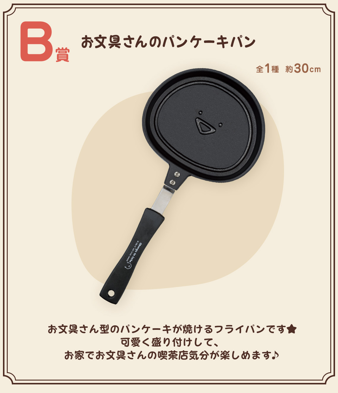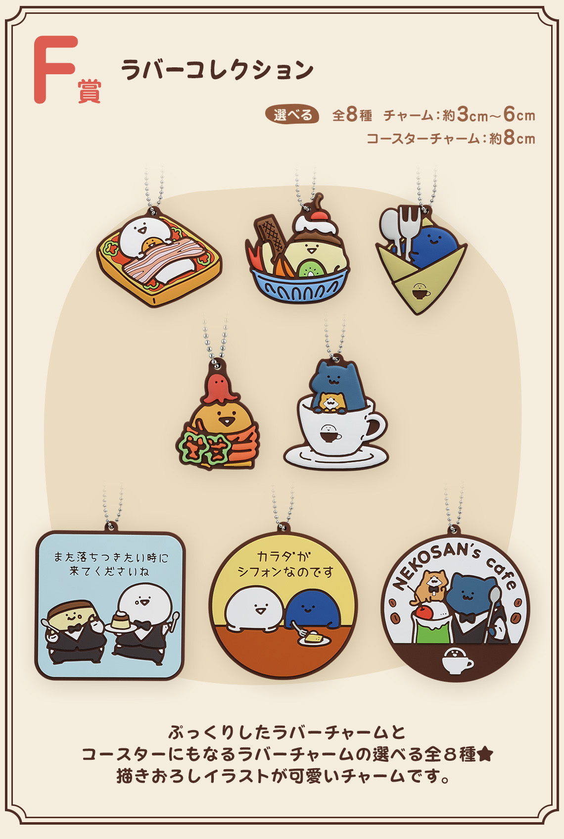 B~F 賞部分分別是文具桑造型鬆餅鍋、造型絨毛吊飾、盤子收藏、收納袋與毛巾收藏以及橡膠吊飾,不只收錄了各種文具桑的可愛造型,也讓文具桑的夥伴布丁桑(プリンさん)、無名氏(名も無き者)、貓咪桑(猫さん)等多位角色登場,不管是哪一級別的賞品都超可愛的!