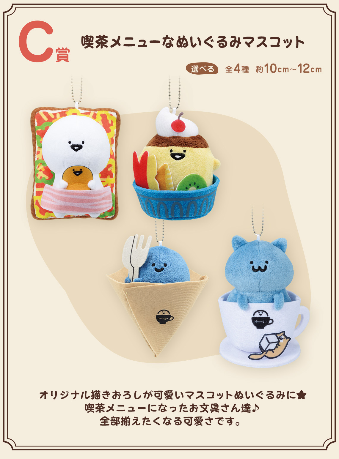 日本人氣插畫家「お文具」自 2018 年開始在社群平台 X(前推特)發布四格漫畫作品,以創作的系列角色「文具桑」(文具さん)聞名,鬆散的人物和溫暖的話語讓人感到舒緩, 因此引起了不少粉絲!本次的「和文具一起(お文具といっしょ)~悠閒的下午茶~」收錄了 A~F、最後一賞以及雙重中獎賞等多種級別賞品,其中 A 賞為正在喝咖啡的文具桑娃娃,軟綿綿的造型搭配手中的咖啡看起來非常讓人放鬆!最後一賞和雙重中獎賞則是蛋包飯的文具桑娃娃,將文具桑包裹在蛋包裡,身上的蛋包圍巾還可以拆卸下來!