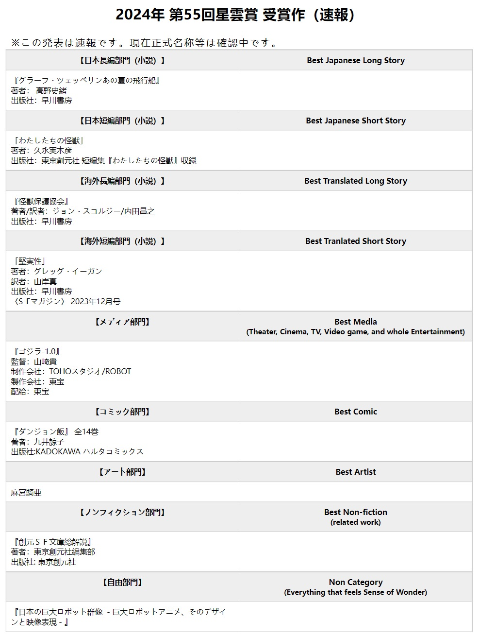 其中又以漫畫部門-由九井諒子所著的《迷宮飯》以及媒體部門- 怪獸電影《哥吉拉-1.0》最受到矚目,正式頒獎典禮將於 2024 年 7 月 6 日日本 SF 大會舉辦。