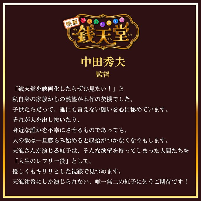 由廣嶋玲子創作、jyajya 繪製的日本兒童小說《神奇柑仔店 錢天堂》(ふしぎ駄菓子屋 銭天堂)於今日 ( 6/6 ) 發表了改編為真人電影的消息,並確定由人氣實力派女星 - 天海祐希飾演主角紅子,同步釋出前導視覺圖 & 前導影片,預定 2024 年 12 月 13 日上映。