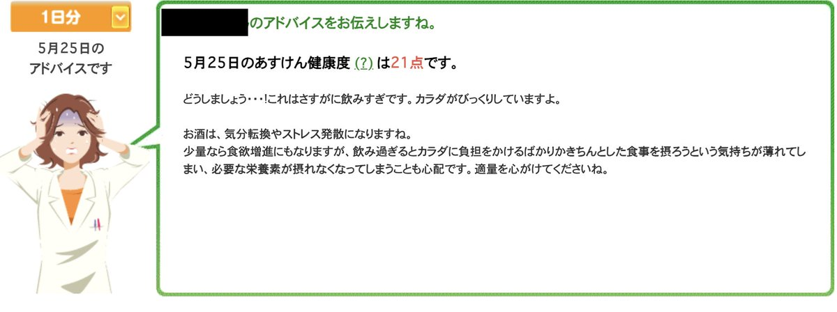 根據「あすけん」的評分標準,健康度滿分是 100 點,只有 6 點的推主...這真的是連 App 內的虛擬助手角色都感到困惑了吧 www。