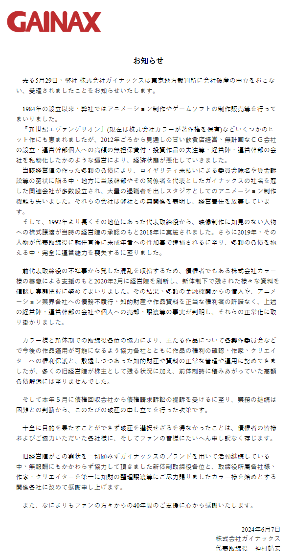 2018 年甚至將股份從 1992 年以來長期擔任該職務的代表董事轉讓給了一位對動畫一竅不通的人,隔年該位董事就被因性侵未成年人而被捕,同時還欠下巨額債務。雖然株式會社 khara 一同協力嘗試消除公司的大量債務,不過公司營運難以負擔這個重責,只能在今日宣布破產。