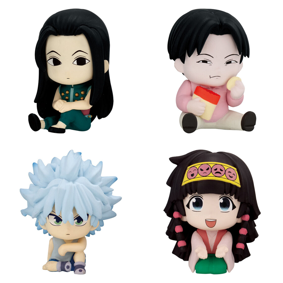 「HUNTER×HUNTER 坐下隊」系列在上一彈的蟻王篇主題後,這次以揍敵客家族的兄弟為主題,推出家族中的四位角色——伊耳謎、糜稽、奇犽、以及阿路加,在約兩頭身的可愛比例下還原角色造型並添加各自的特色,這次的奇犽便是以發動念能力身體通電的刺蝟頭髮型亮相,糜稽則是呈現吃著零食模樣,將四兄弟一字展開排排坐的樣子非常可愛!