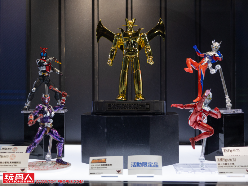 首先就是要提到本次的展覽重點、在高雄以全台首度展示之姿登場的 S.H.Figuarts「GOLDDASH」、S.H.Figuarts 真骨雕製法「假面騎士SAGA」以及超合金「異靈鋼彈」!尺寸相當驚人的「無敵王者 Jumbo Machineder 無敵鐵金剛」也超級帥啊。