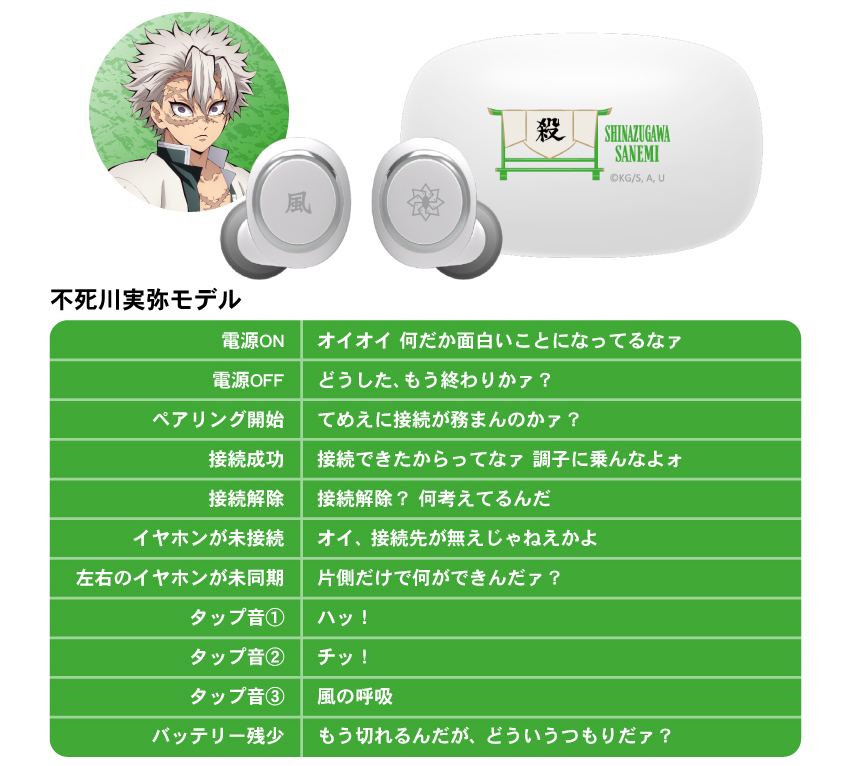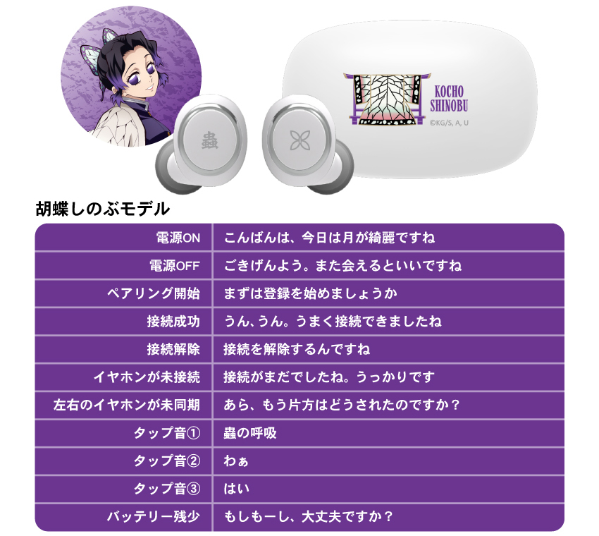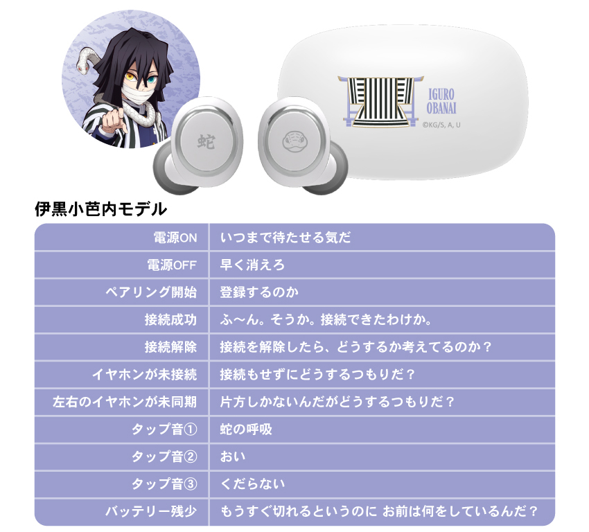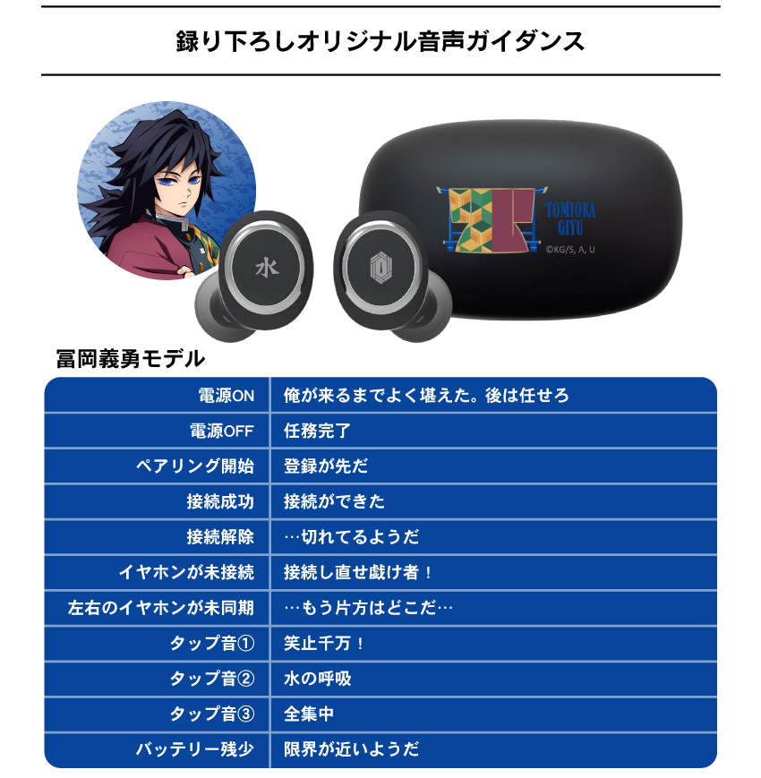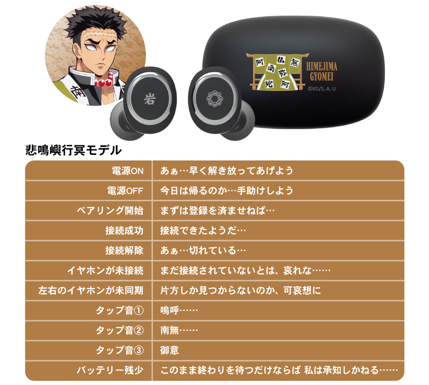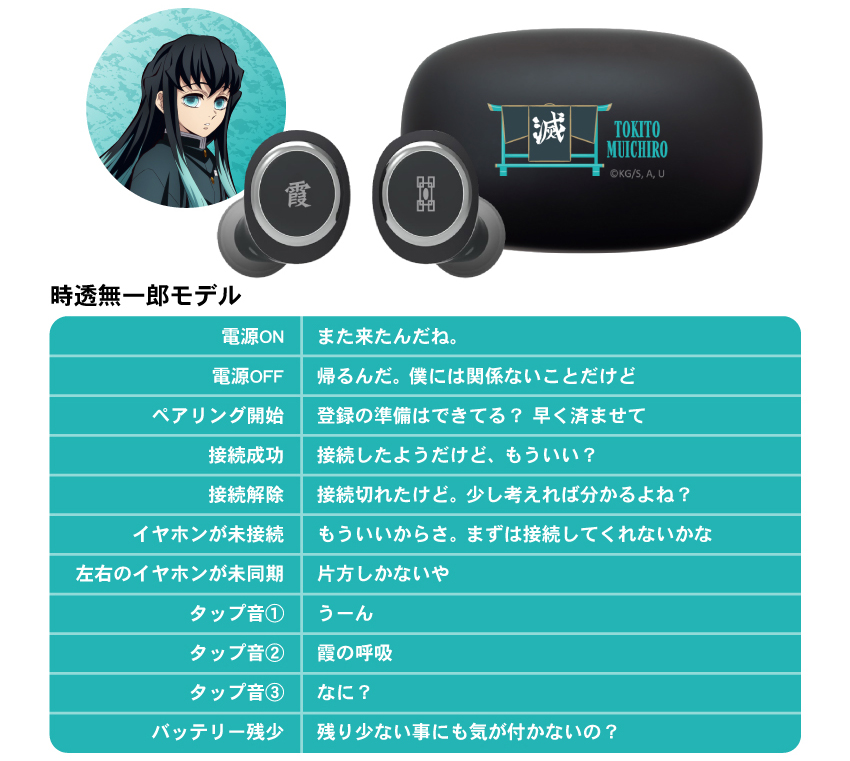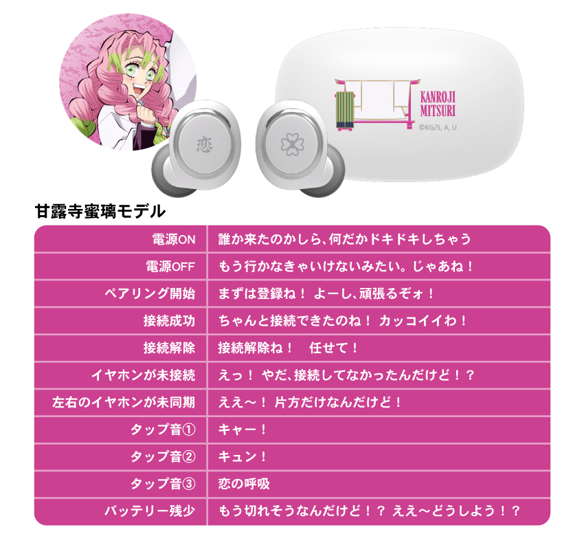 這次一次推出九柱的各別款式,每一個上面都有著特色設計在裏頭,耳機本體兩邊都有著所代表的柱名稱 & 日輪刀刀鍔的圖案,充電收納盒則有著人物的英文名稱以及羽織圖案。