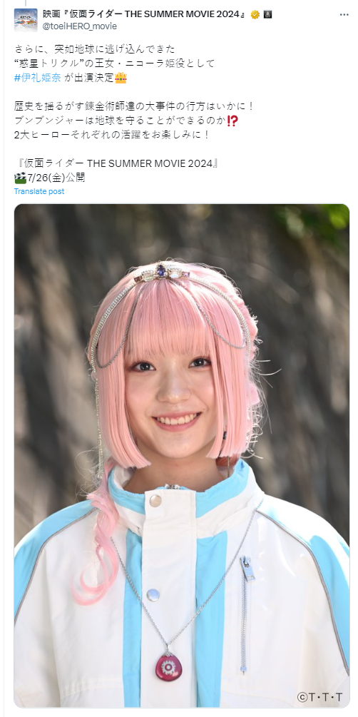 飾演「惑星トリクル」王女ニコーラ姫的伊禮姬奈,代表作為真人版《神推偶像登上武道館我就死而無憾》出演主角市井舞菜,這次的扮相也正式揭露。
