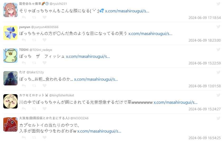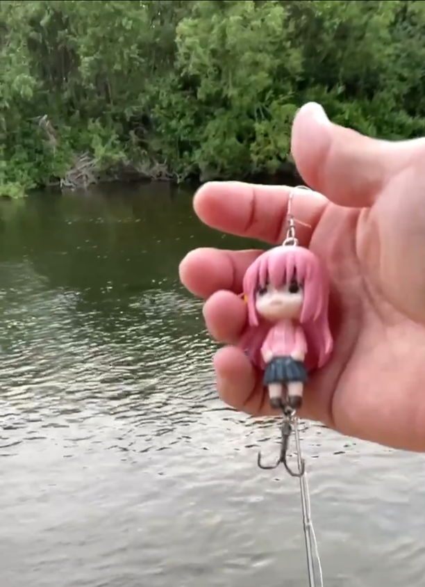 從推主的影片來看,還真的只有把「波奇醬」的迷你模型附在魚鉤上,沒有加上任何的食物餌引誘,沒想到才扔下去沒多久就有動靜,馬上一條魚就上鉤捕獲,太神奇了波奇醬!
