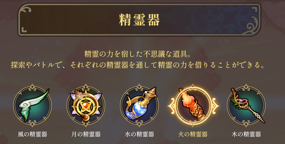在冒險中可以獲得道具「精靈器」,共有五種屬性可以讓你的戰鬥有千變萬化的效果。