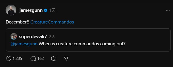 當然,最詳細的日期官方是尚未完整公布,不過詹姆士·岡恩在Threads上回應網友問題時,他直接透露了《生物突擊隊》動畫影集的首播,將會安排於2024年12月期間開播,並以「第一章:諸神與怪物」來做為故事的開端,本作也將在串流平台Max(原HBO Max)播出,總集數共為7集。